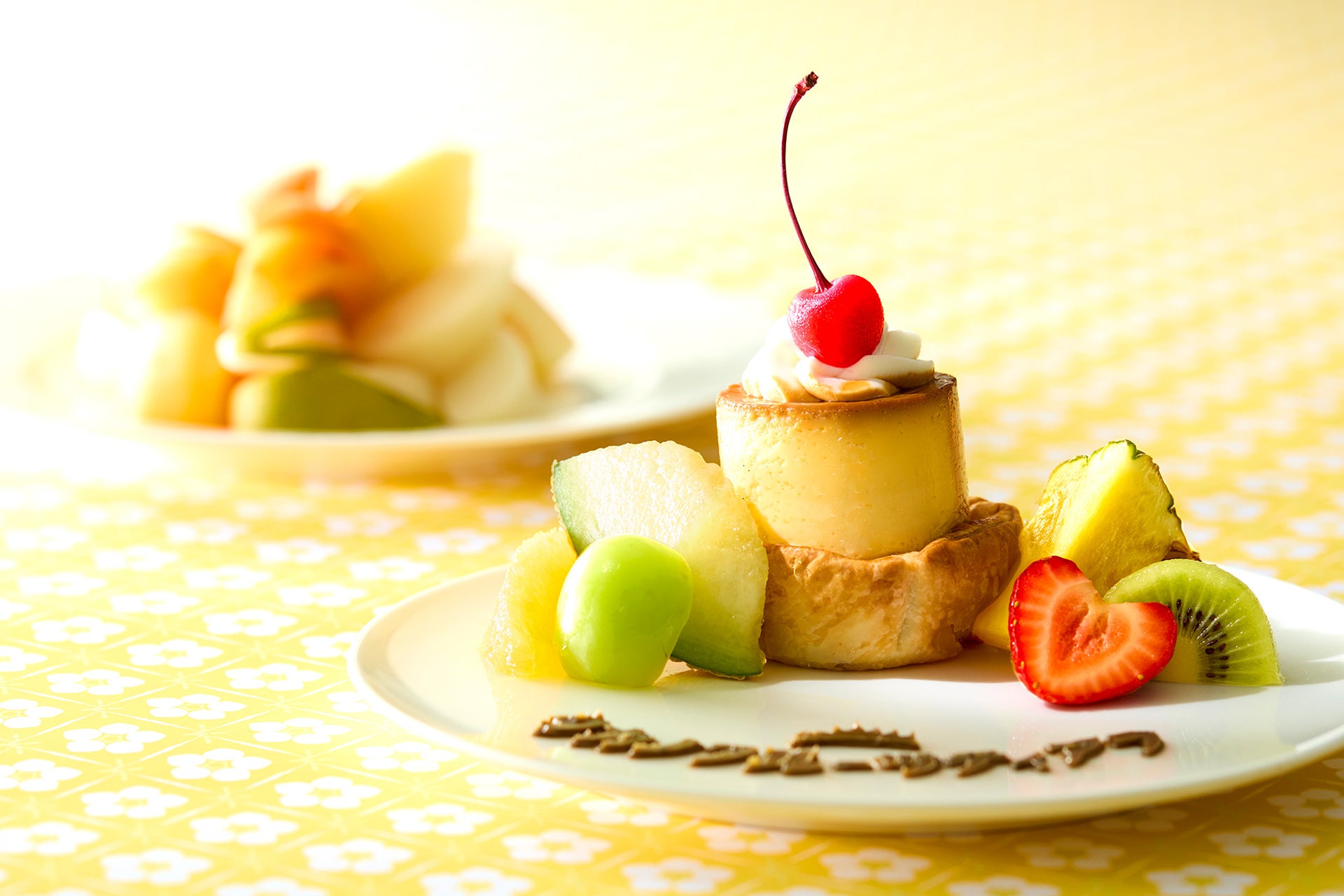 アフタヌーンティーの上段にあるプリンは、タカノフルーツティアラオリジナルの仕立てです。昔ながらの固めの食感で、ホイップクリームとさくらんぼのシラップ漬けをトッピングしています。