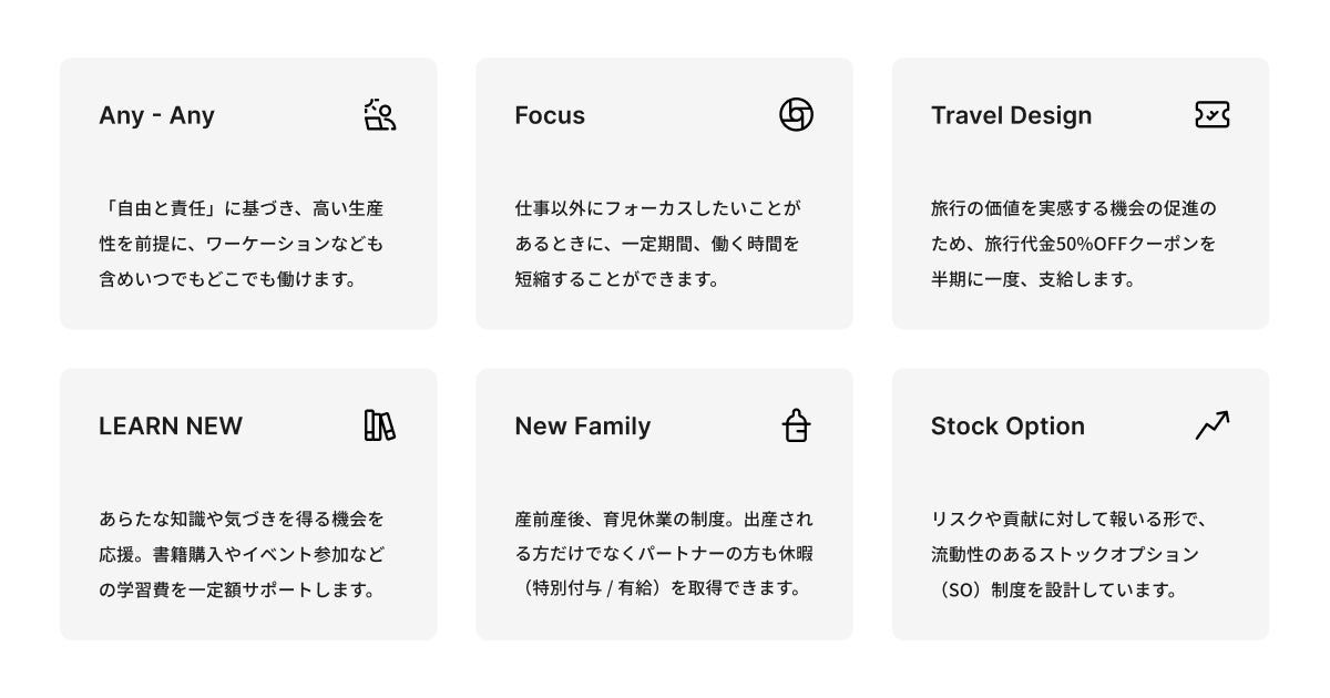「自由と責任」に基づき、プロとしての責任を果たす前提でいつでもどこでも働けるような働き方を推進しています。