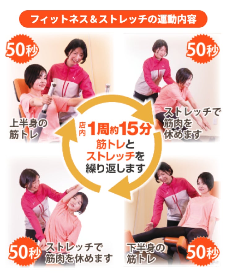 フィットネス&ストレッチは女性専用の30分通い放題フィットネスです。マシン運動とストレッチを約1分ずつ交互に繰り返すことで柔軟性と筋力の発達をサポートします。毎月変わるストレッチメニューが人気です。