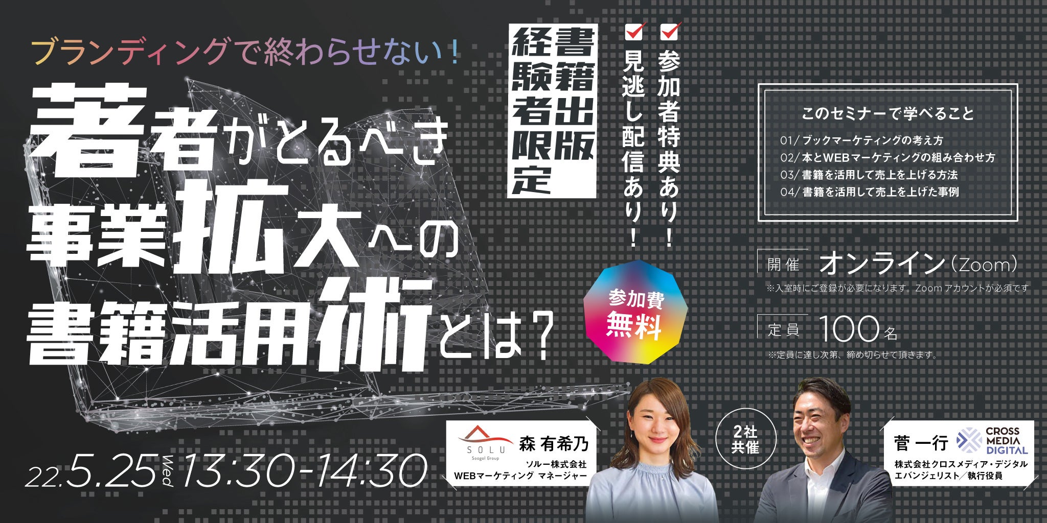 クロスメディアグループ(所在地:東京都渋谷区千駄ヶ谷 代表取締役:小早川幸一郎)のグループ会社である、株式会社クロスメディア・マーケティングは、2022年5月25日(水)株式会社クロスメディア・デジタル 執行役員 菅一行氏と、ソルー株式会社 マネージャー 森 有希乃氏による共催セミナーとして「ブランディングで終わらせない!著者がとるべき事業拡大への書籍活用術とは?」を開催致します。