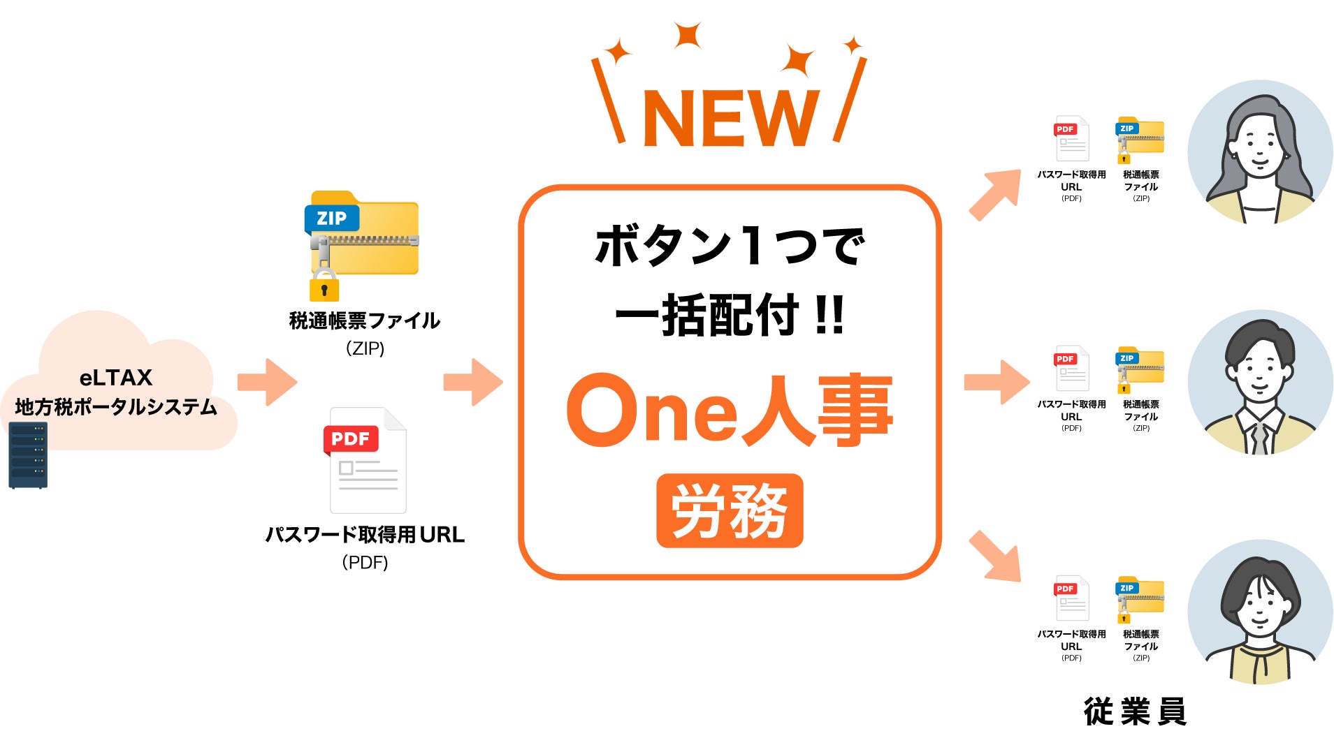 「One人事[労務]」では、事業者がeLTAXから受け取った税額通知書の電子データを従業員に個別配付することが可能となりました。また、「データを間違いなく個別で送るのはハードルが高い」とのお客様からの声も反映し、「One人事[労務]」の書類配付機能ではeLTAXからダウンロードした通知書ファイル(2通)を一括して従業員様へ個別に配付することができるように開発しました。データを誤送するリスクも回避でき、紙で届いた税額通知書の仕分けや送付する事務手続きが不要、業務の効率化やコストの削減が可能です。ぜひご利用ください。