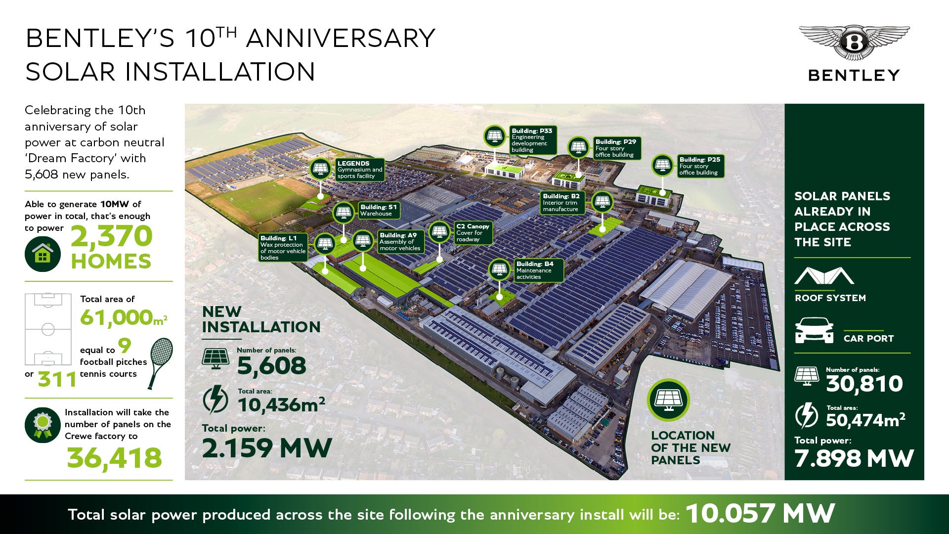 この発表は、ベントレーの全モデルが製造されているピムズ・レーンの工場で初めてソーラーパネルが設置されてから10周年を迎えることに合わせて行われました。このソーラーパネルの総面積は60,911 ㎡で、サッカー場9面分、テニスコート311面分に相当します。