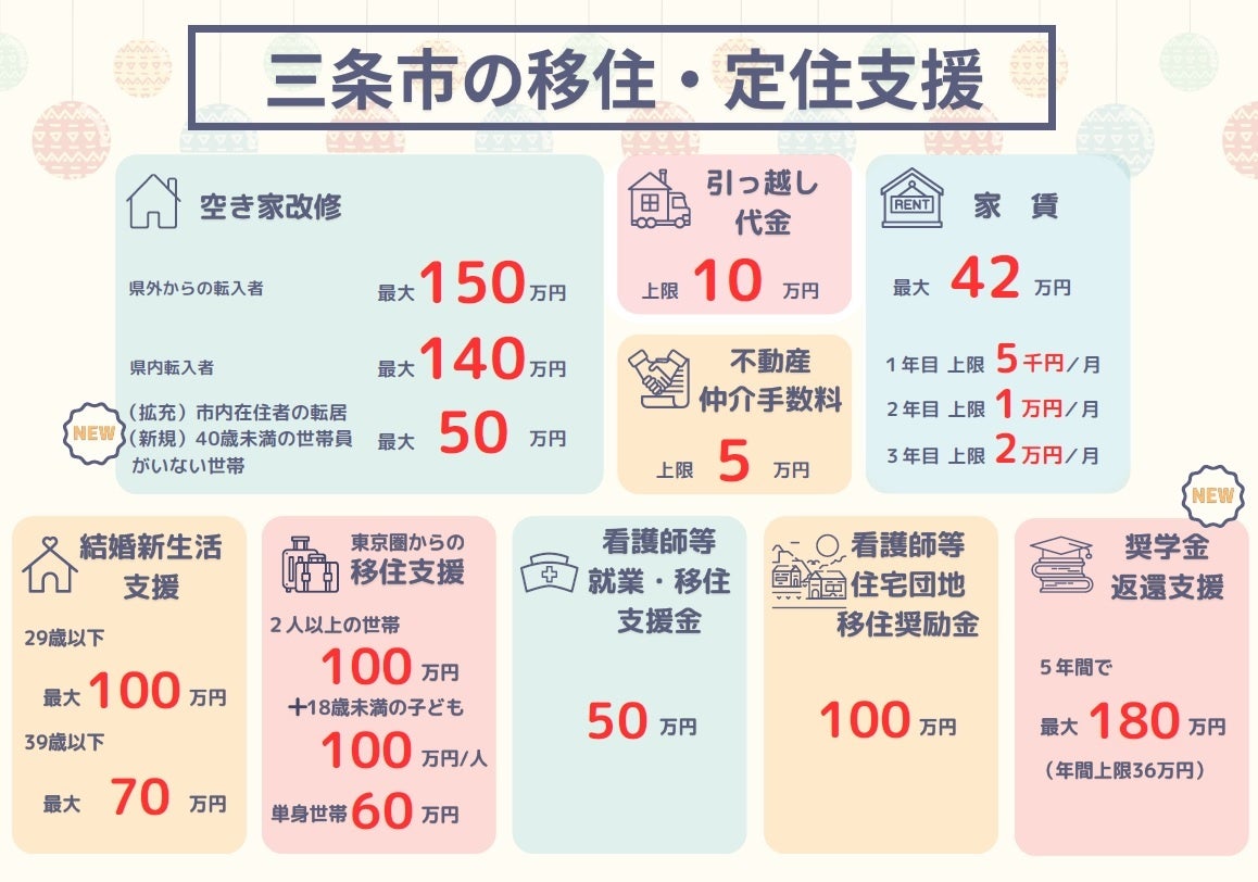 三条市への移住・定住を促進するため、「奨学金返還支援補助金」を新設するほか、「空き家改修補助金」及び「結婚新生活支援事業補助金」の補助内容を拡充します。
