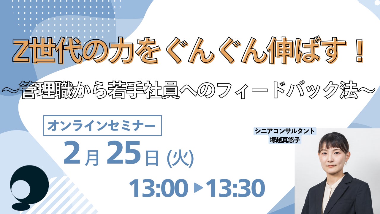 組織・人事コンサルティングファームであるセレクションアンドバリエーション株式会社(以下、当社、東京都千代田区丸の内、大阪市西区、名古屋市西区 / 代表取締役社長:平康慶浩/ URL:https://sele-vari.co.jp/ )は「Z世代の力をぐんぐん伸ばす!~管理職から若手社員へのフィードバック法~」セミナーを2025年2月25日(火)13:00〜13:30に開催することをお知らせいたします。