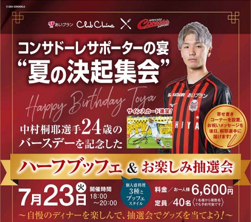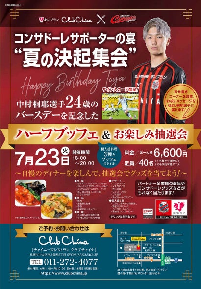 株式会社あいプラン(北海道札幌市)の札幌市のレストラン クラブチャイナでは、2024年7月23日(火)に、北海道コンサドーレ札幌サポーターの宴「夏の決起集会」を開催します。ハーフビュッフェコースでは、17種類のお料理を食べ放題。パートナー企業様の商品やコンサドーレグッズが当たるお楽しみ抽選会も!
