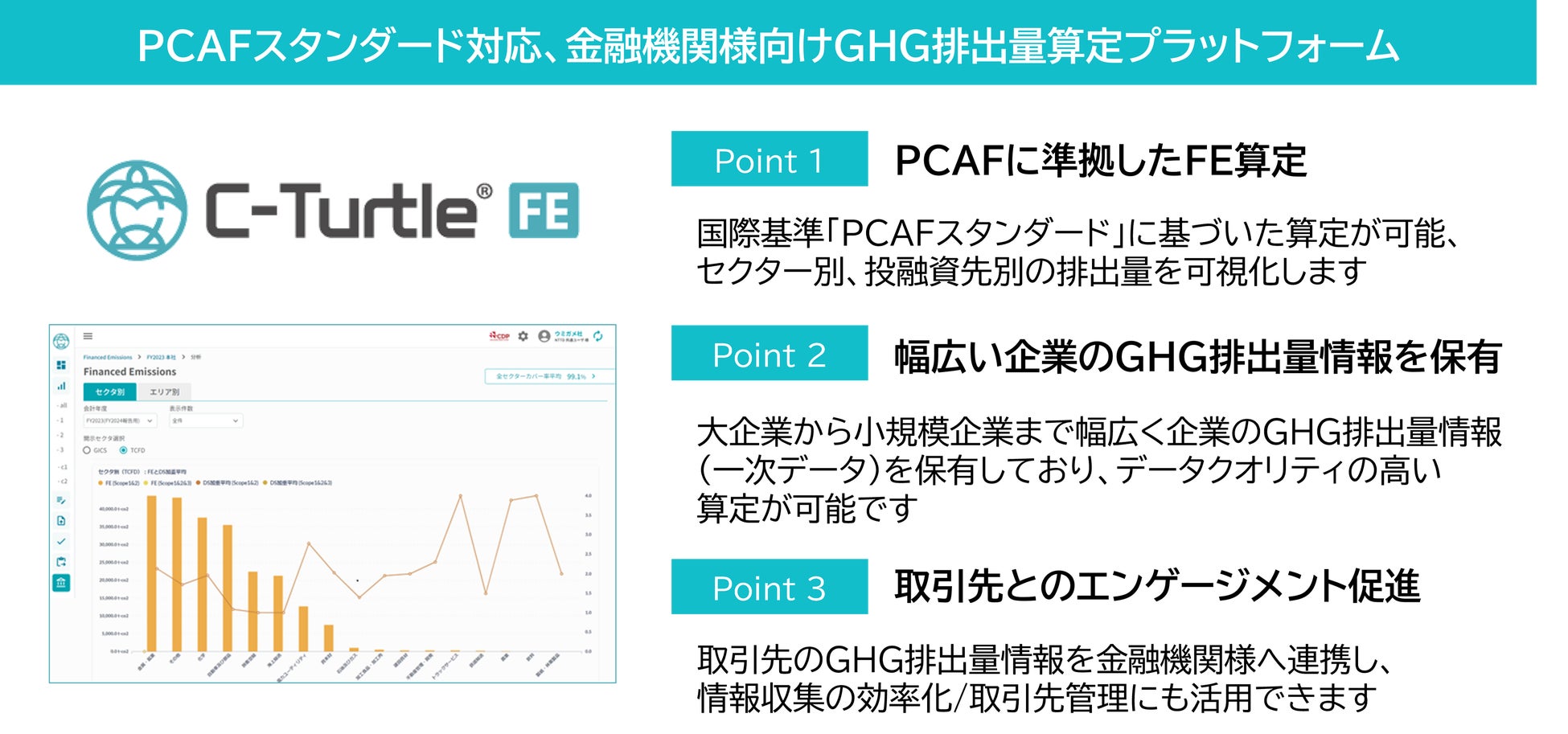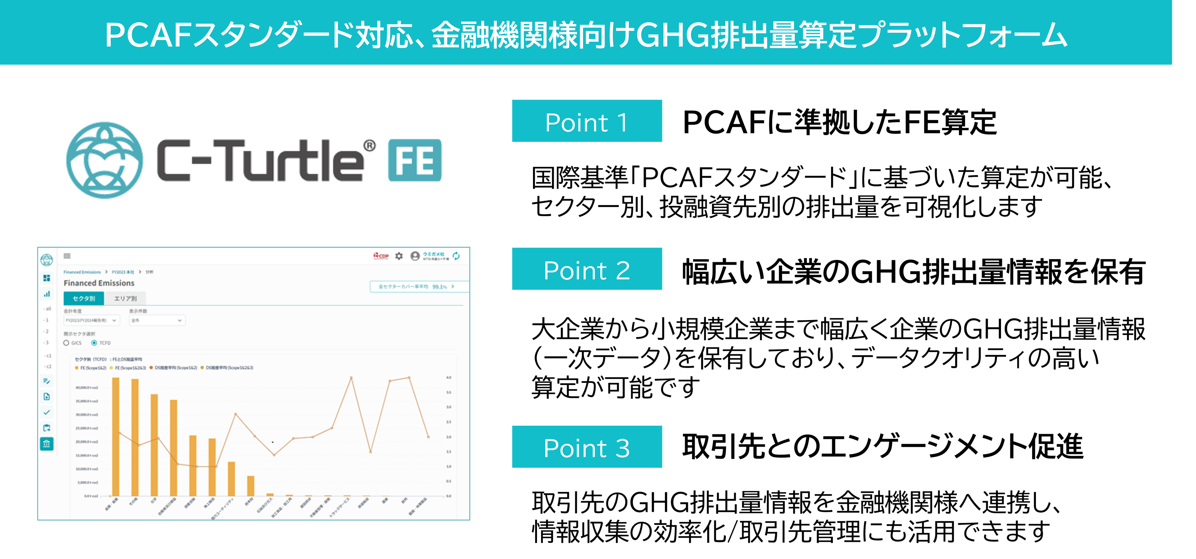 株式会社NTTデータ(代表取締役社長 鈴木 正範、以下「NTTデータ」)とNTTビジネスソリューションズ株式会社(代表取締役社長 木上 秀則、以下「NTTビジネスソリューションズ」)は、株式会社阿波銀行(代表取締役頭取 福永 丈久、以下「阿波銀行」)に、金融機関およびその投融資先を対象とした温室効果ガス(以下「GHG」)排出量可視化プラットフォーム「C-Turtle FE(シータートル エフイー)」を提供し、阿波銀行の投融資先に「C-Turtle®※1(シータートル)」を提供します。C-Turtle FEの導入は、徳島県に本店を置く金融機関としては初めてです。NTTビジネスソリューションズおよびNTTデータは、阿波銀行との連携を通じて、地域企業が自社のGHG排出量を把握し、データに基づいた経営判断を可能とする環境の整備を進めます。これにより、地域の脱炭素経営の実現を推進し、持続可能な社会の構築に貢献します。
