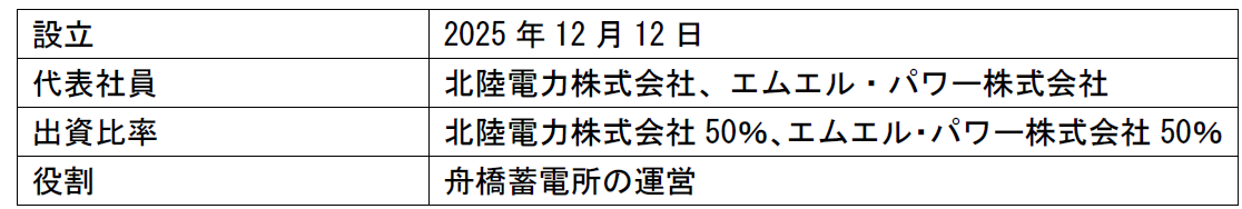 北陸電力株式会社(以下「北陸電力」)およびみずほリース株式会社(以下「みずほリース」)の100%子会社であるエムエル・パワー株式会社(以下「エムエル・パワー」)は、「舟橋蓄電所合同会社」を設立し、富山県中新川郡舟橋村における2027年4月の蓄電所運開を目指し、系統用蓄電池事業に参入しますので、お知らせいたします。