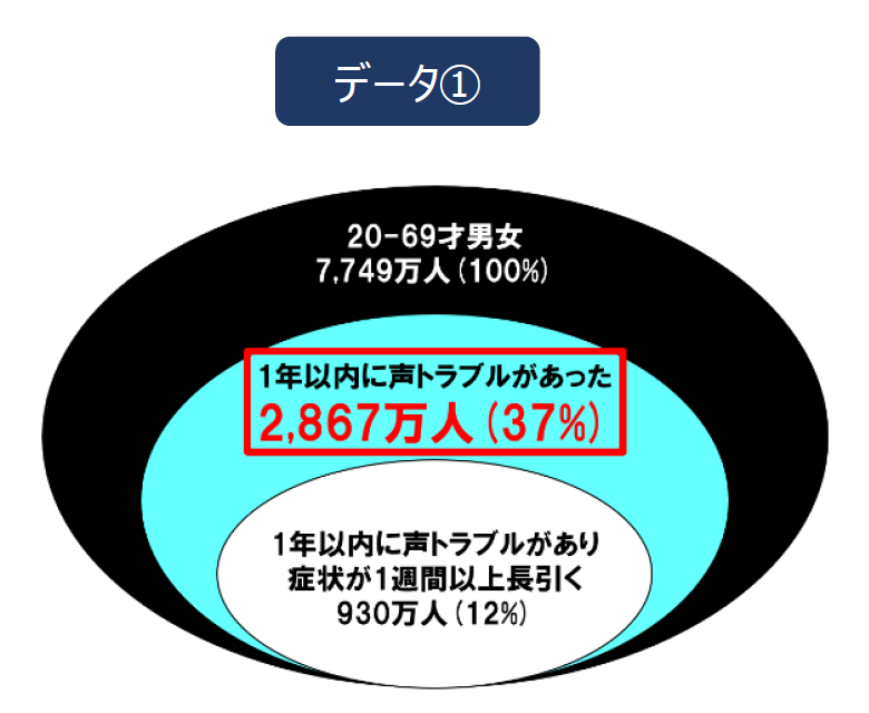 弊社調査によると、20~69歳男女のうち、1年以内に「声のトラブル」があった方は2,867万人、約3人に1人(37%)に上ることが分かりました。(データ①)※1