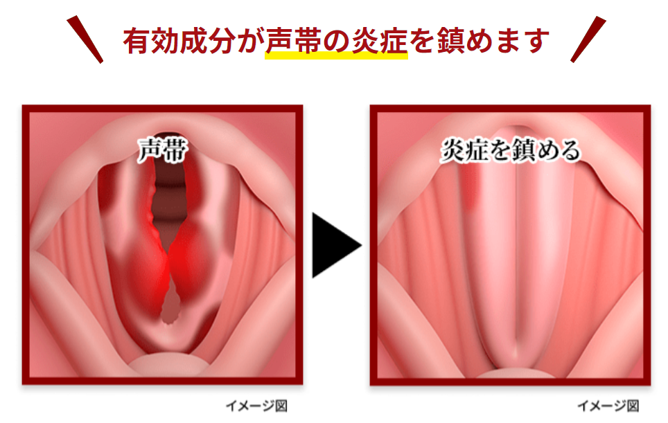 漢方薬の“響声破笛丸(きょうせいはてきがん)”を使用した当製品は声帯の炎症を抑えて、声帯の形態変化を抑制することで「声がれ」を改善いたします。