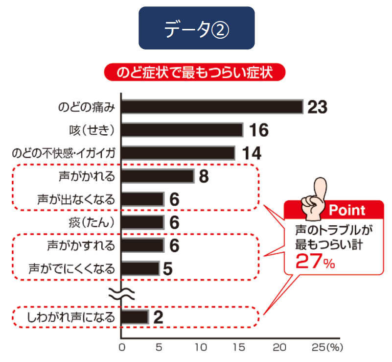 また、「のど症状で最もつらい症状」では、“声がかれる”“声がでなくなる”などの声のトラブルを挙げた方の合計が約3割(27%)と“のどの痛み”と同等以上いることがわかりました(データ②)※2