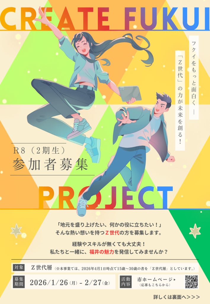 福井市は、地域の課題解決にZ世代の意見を取り入れる「クリエイトフクイプロジェクト」の2025年度活動報告会を2026年2月14日に開催しましたので、お知らせいたします。本プロジェクトは、Z世代の若手職員チームが市政に若者の意見を取り入れようと発案し、2025年度にスタートしました。公募に応募いただいた高校生や学生、社会人など42人の「福井市Z世代クリエイター」が7課のチームに分かれ、市役所職員と共に課題解決に取り組みました。