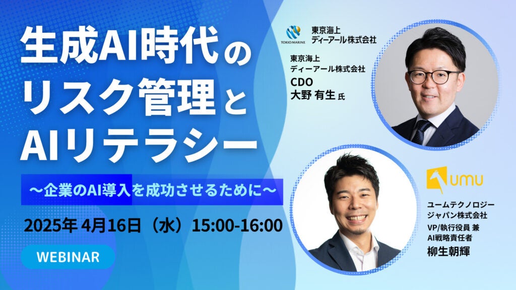 ユームテクノロジージャパン株式会社(本社:東京都新宿区、代表取締役:松田しゅう平、https://www.umujapan.co.jp、以下 ユームテクノロジージャパン)は、東京海上ディーアール株式会社(本社:東京都千代田区、代表取締役社長 水野 一幸、以下 東京海上ディーアール)と共同で、「生成AI時代のリスク管理とAIリテラシー〜企業のAI導入を成功させるために〜」と題するオンラインセミナーを、2025年4月16日(水)15:00〜より開催いたします。