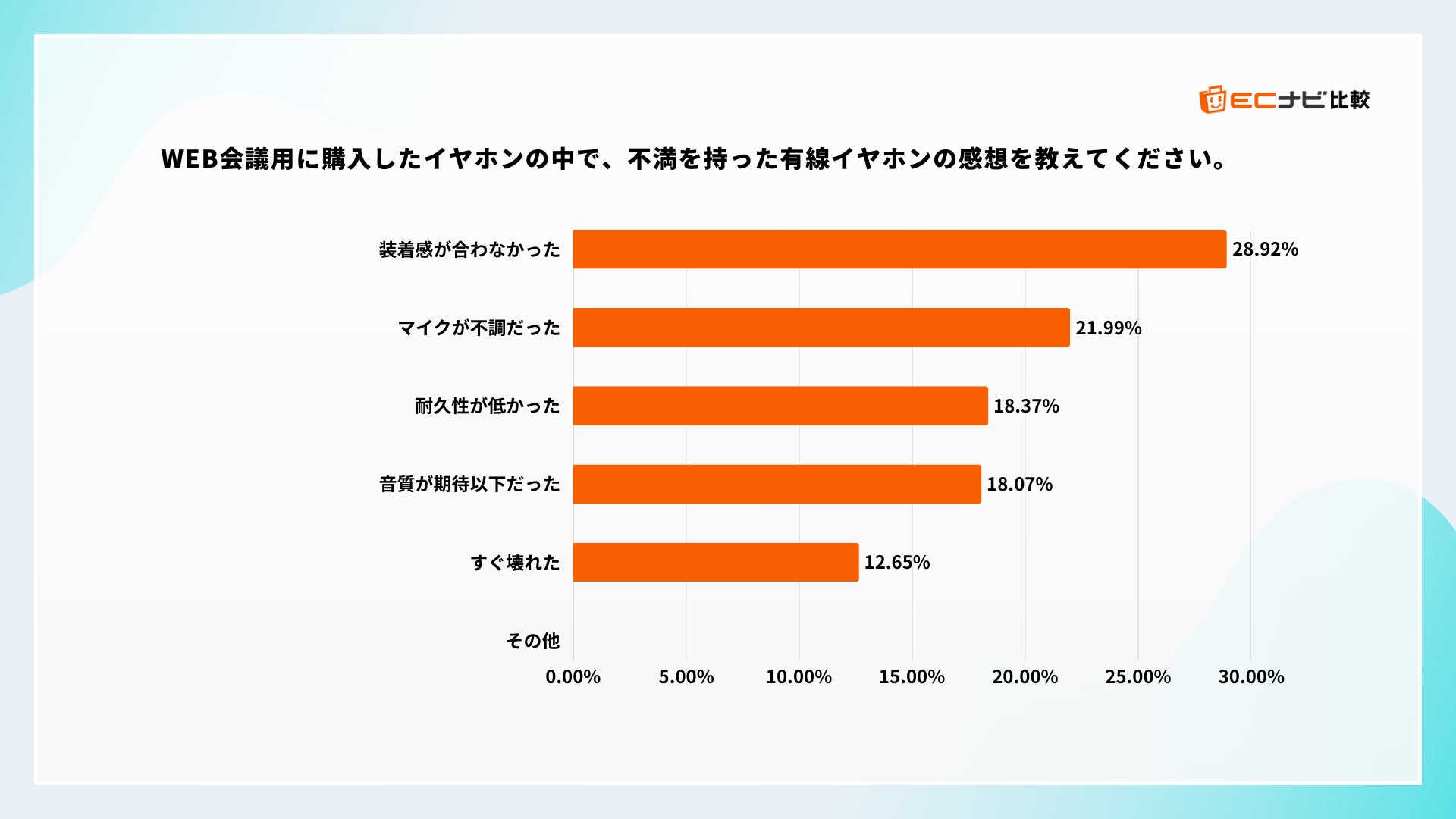ウェブ会議用に購入したイヤホンの中で不満を持った点について聞いたところ、「装着感が合わなかった」(28.9%)が最も多く、次いで「マイクが不調だった」(22.0%)、「耐久性が低かった」(18.4%)、「音質が期待以下だった」(18.1%)という結果となりました。長時間使用する業務用ツールとして、快適性や信頼性に対する期待が高いことがわかります。