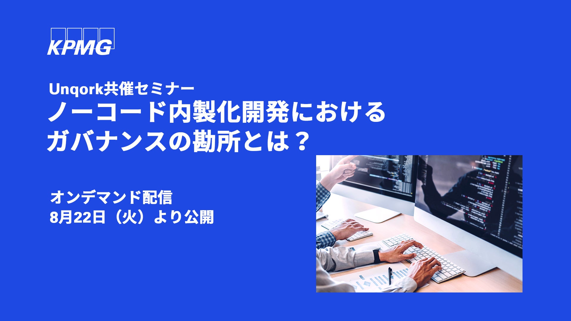 本セミナーでは、ノーコードツール内製開発の効果や課題、リスクを概観し、内製開発を成功させるために必要なガバナンスを解説します。また、共催社のUnqork.Incより、ノーコード開発プラットフォーム「Unqork」の機能についてデモを交えて解説するとともに、実際の開発事例を紹介します。