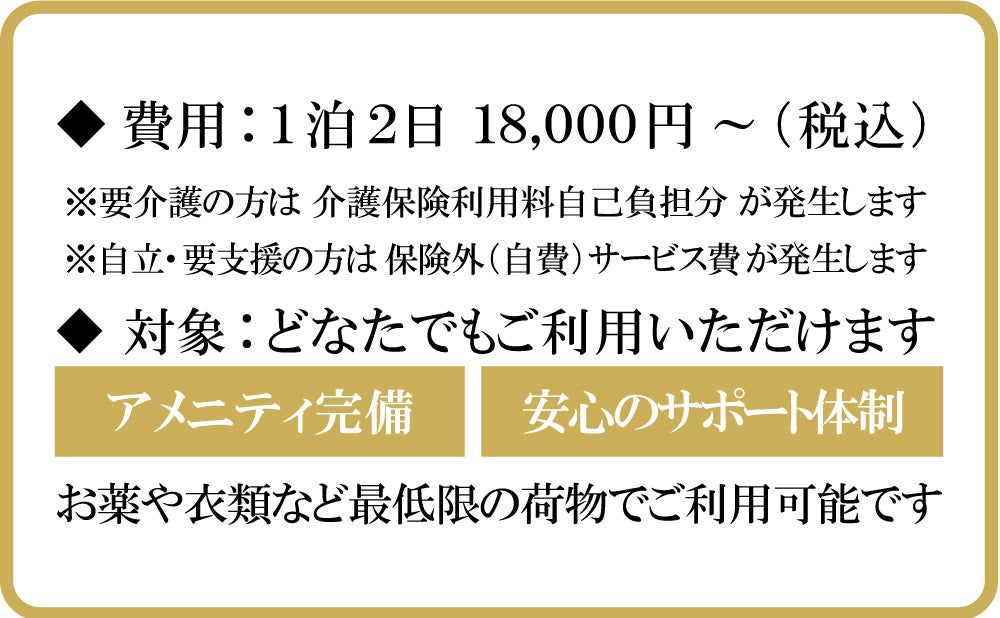 (お薬や衣類など最低限の荷物でご利用可能です)