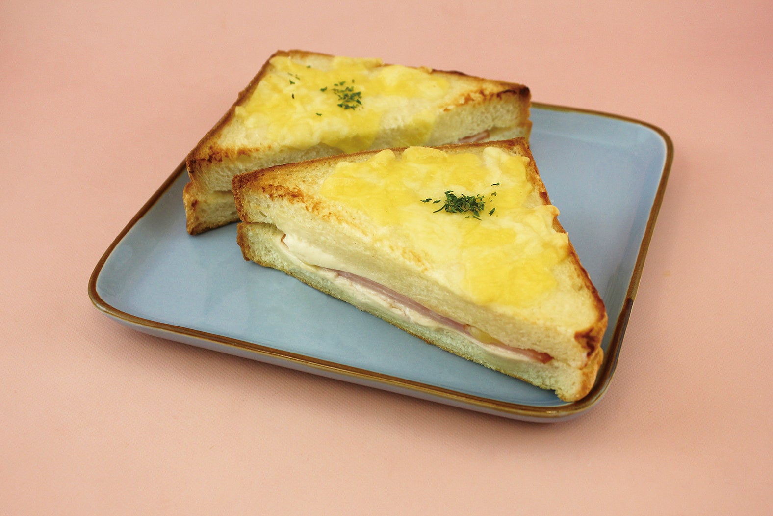 パンドミーにハム・ホワイトソース・チーズをはさみ焼き上げました。クロックムッシュはフランスでは定番の軽食。とろけるチーズとハムの旨味が、まろやかなホワイトソースのコクを引き立てます。