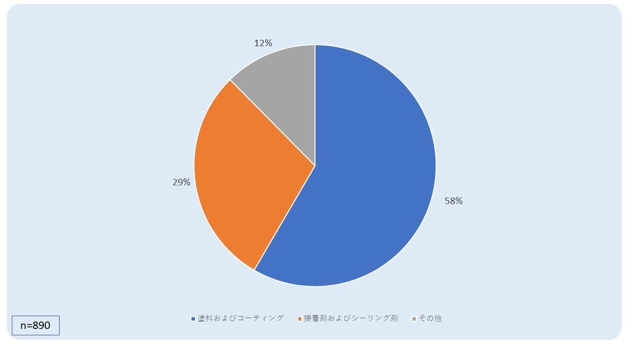 - アクリル樹脂の用途をみると、塗料およびコーティングが最も多く、58.4%を占めました。接着剤およびシーリング材は29.2%を占め、その他の用途は12.4%でした。