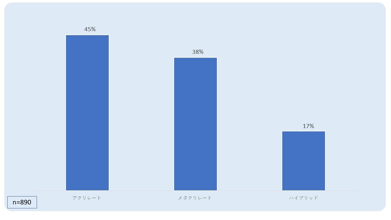 - 調査結果によると、大半の回答者(44.7%)が主にアクリレートを製造または利用しており、次いでメタクリレートが38.2%でした。ハイブリッドアクリル樹脂の利用は17.1%で回答さ れました。