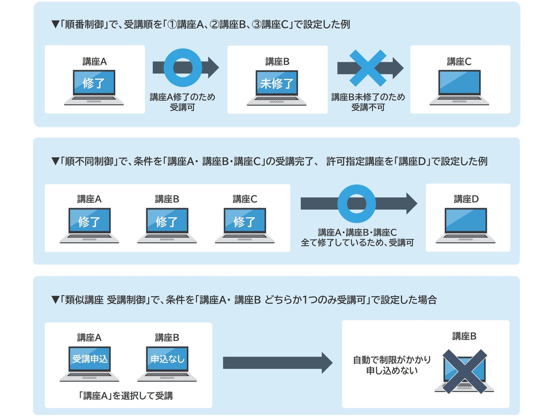 「コースウェア機能」及び「類似講座 受講制御機能」の詳細については、こちらをご覧ください。