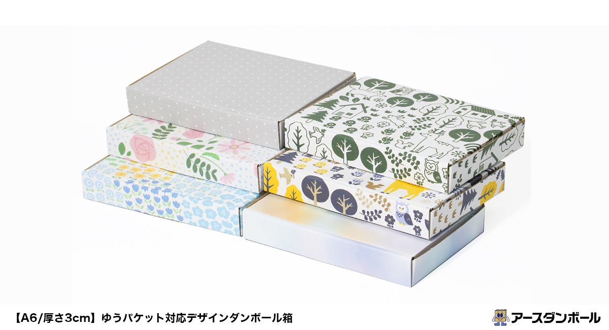 ギフト製品やプレゼントの梱包箱として便利なサイズの段ボール箱に「全面デザイン入り」の製品が新登場!ゆうパケット・クリックポスト・定形外郵便などの発送箱としてもご利用可能