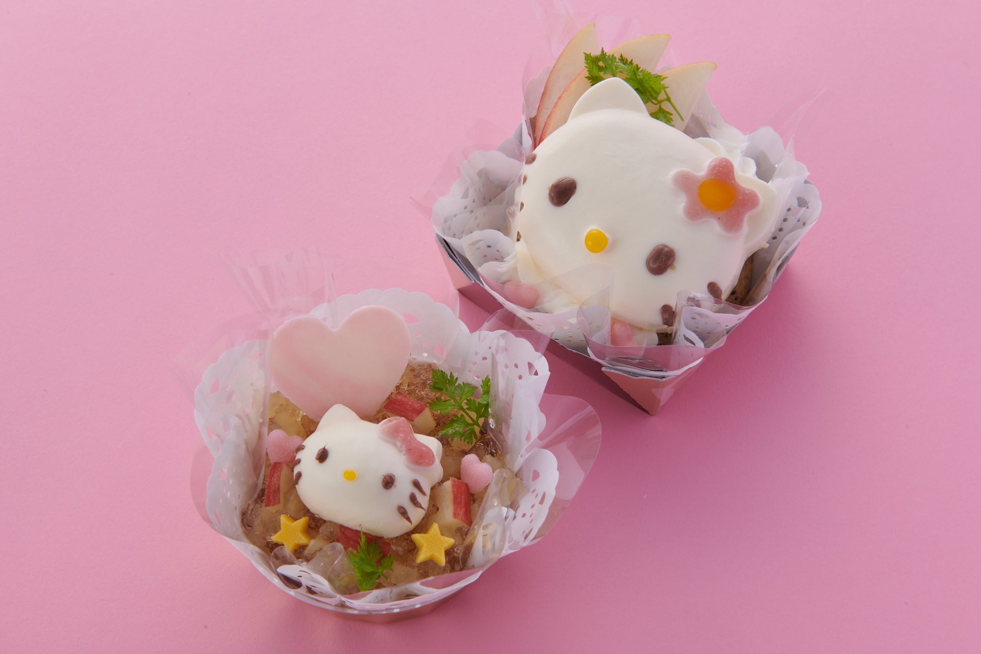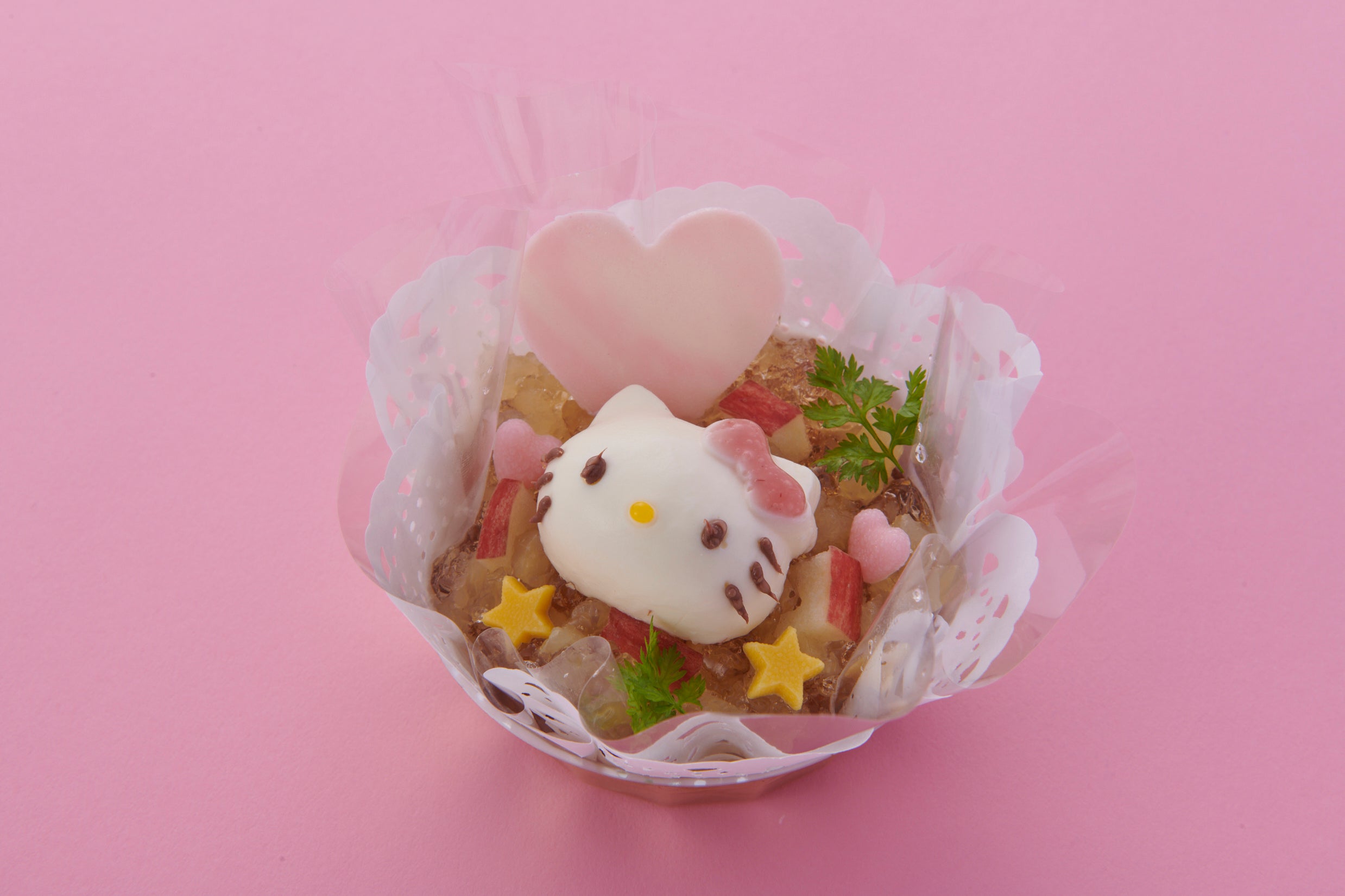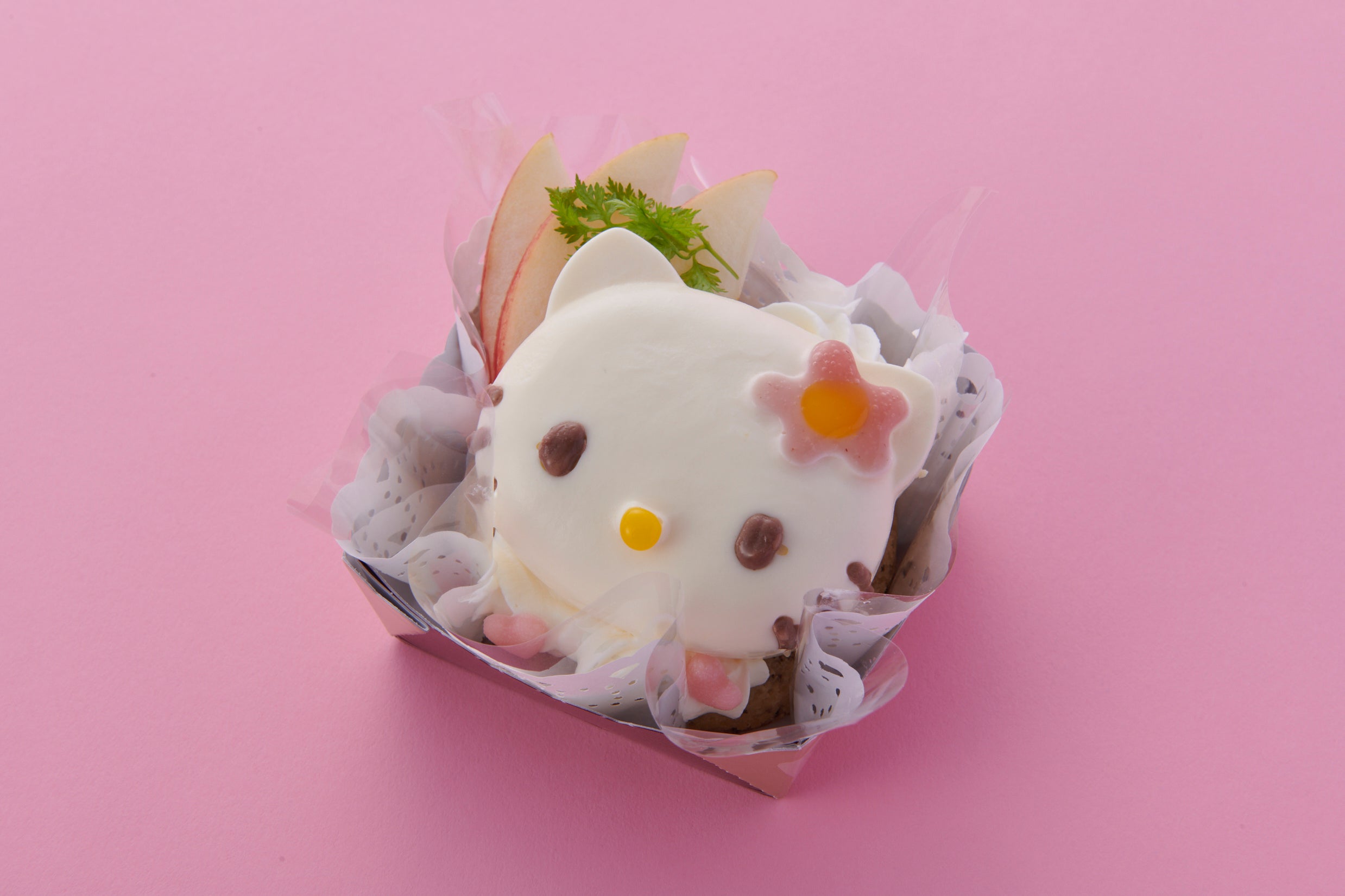 リンゴのコンポートとアップルティーの茶葉を生地に練り込んだ焼きドーナツに、歯ごたえの異なるフレッシュとコンポートのリンゴ入り特製リンゴジュレと生クリーム、そしてレアチーズムースで作った大きなハローキティを乗せました。レアチーズムースの中にも特製リンゴジュレが入っていますので、飽きずに楽しく食べていただけます。