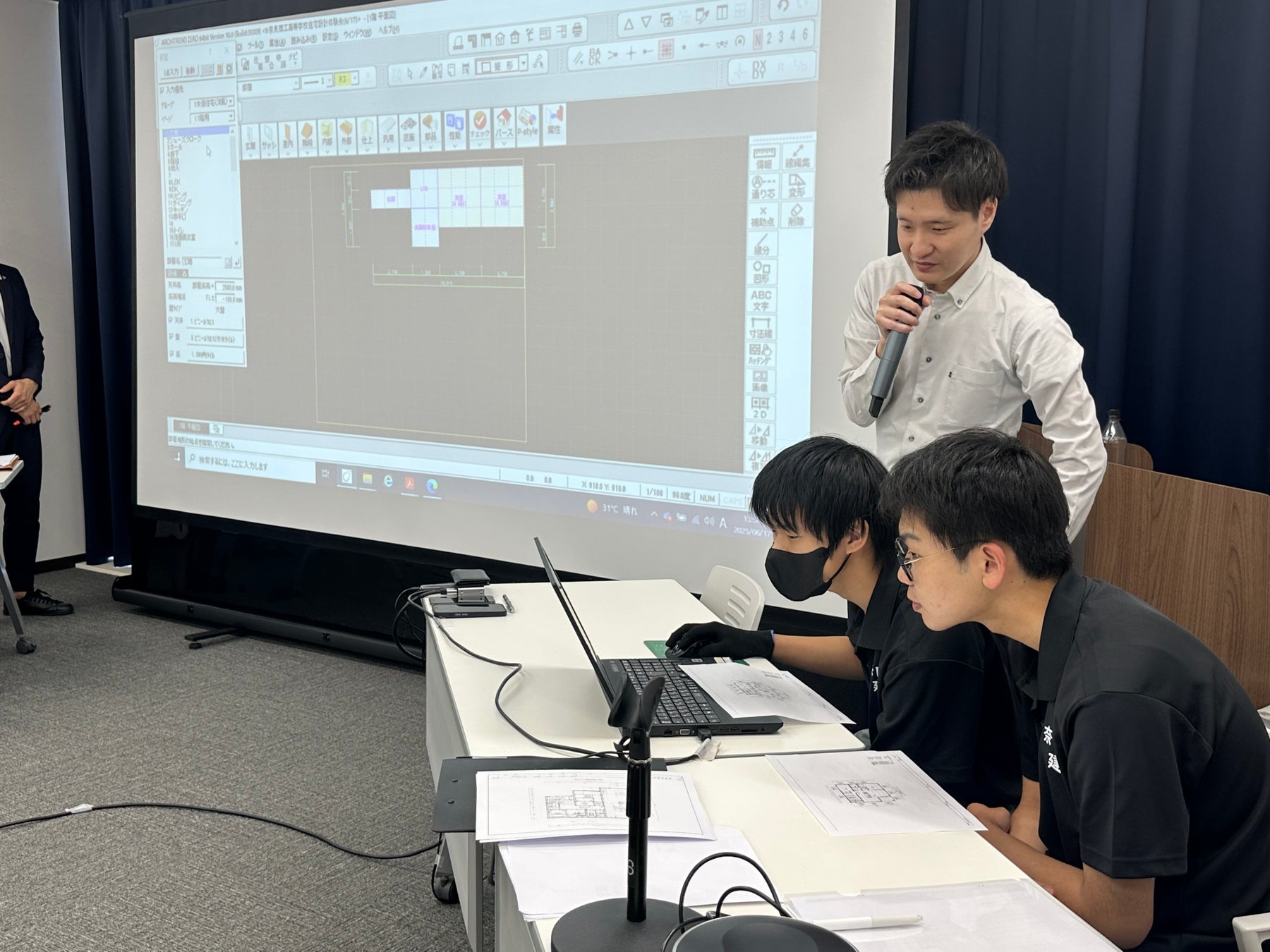 「住宅設計体験会」では、一建設の社員より住宅設計の仕事内容の説明や3D CADを使った住宅設計の実演を行い、代表して2名の高校生が3D CADを実際に操作しました。また、体験会に参加した高校生全員が、作図用方眼紙に“自分の住みたい家(平屋住宅)”の住宅図面を作成し、代表して4名の高校生が作成した住宅図面の発表をしました。