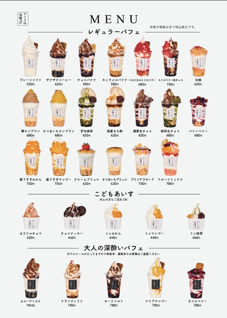 管理栄養士の資格を持つ、弟・直也がメニューを監修しています。思わず写真を撮りたくなる映える盛り付けのパフェ、小さめサイズの「こどもあいす」、リキュールソースをかけた「大人の深酔いパフェ」など常時約30種類ご用意。旬の素材を使った限定メニューも登場します。
