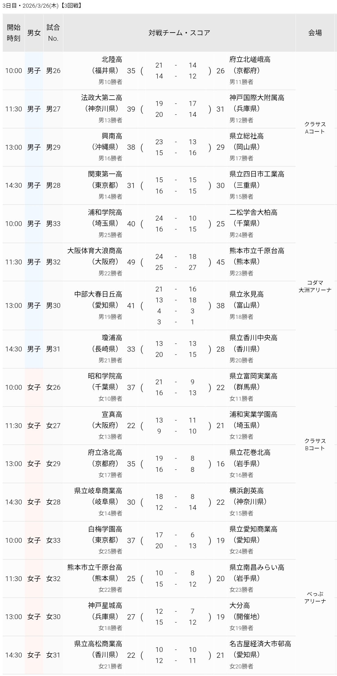 3回戦の全試合が終了し、男女それぞれでベスト8が出そろいました。