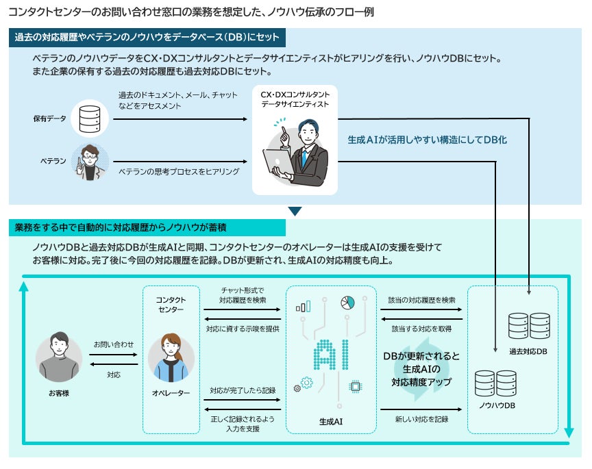 本サービスは、コンタクトセンターに蓄積するベテランの属人ノウハウや過去の対応履歴をデータベース化し、新人担当者等の業務における問題発生の際に、生成AIがベテランに代わって原因の特定や、解決の示唆を行う一連の業務フロー・システムです。アセスメントや試験運用から業務実装まで、各企業のニーズに合わせたサービス提供が可能です。