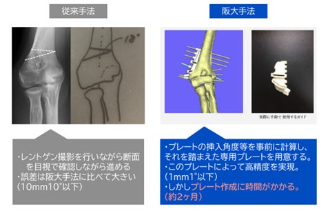 この課題解決のため、大阪大学では上肢骨折後変形治癒(変形した骨を矯正するために指定の角度で切断し、再度接着する手術)における新手法を構築しており、医師のスキルに依存せずに1mm1°以下の誤差という高精度を実現しています。具体的には、患者の骨のCT画像検査データを用いて事前に骨切りの入射角を決め、その入射角で切断を可能にする手術ガイド(専用の器具)を設計・製造することで、手術ガイドを骨に設置すれば医師がレントゲン等で目視確認をすることなく1mm1°以下という高精度に骨切りを行うことを可能にするというものです。