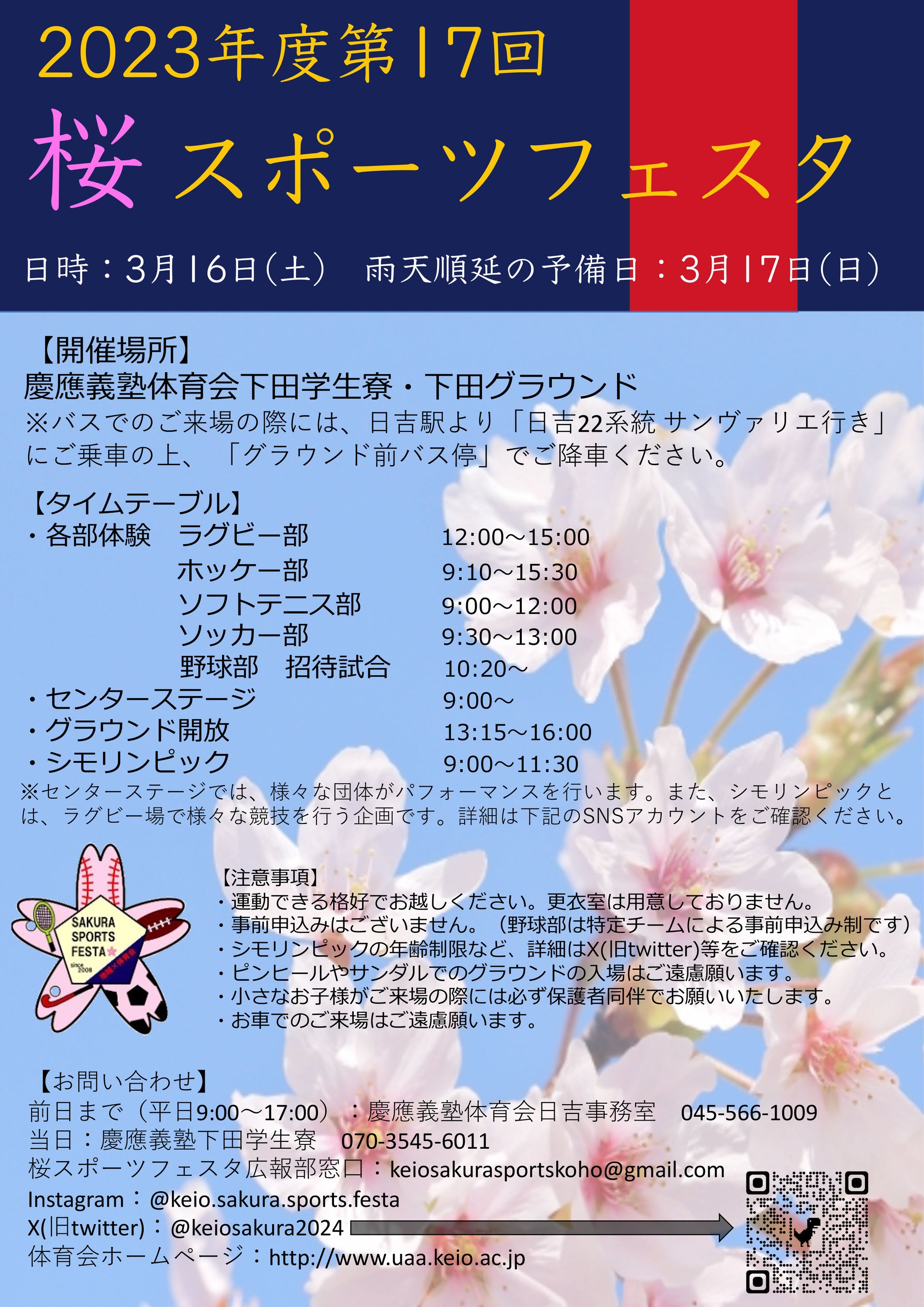 3月16日(土)、慶應義塾体育会は「地域と学生の交流」をテーマに、「第17回桜スポーツフェスタ」を下田グラウンドおよび下田学生寮(横浜市港北区日吉本町)にて開催いたします。