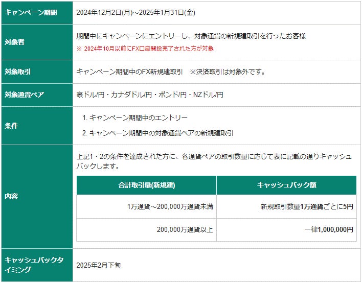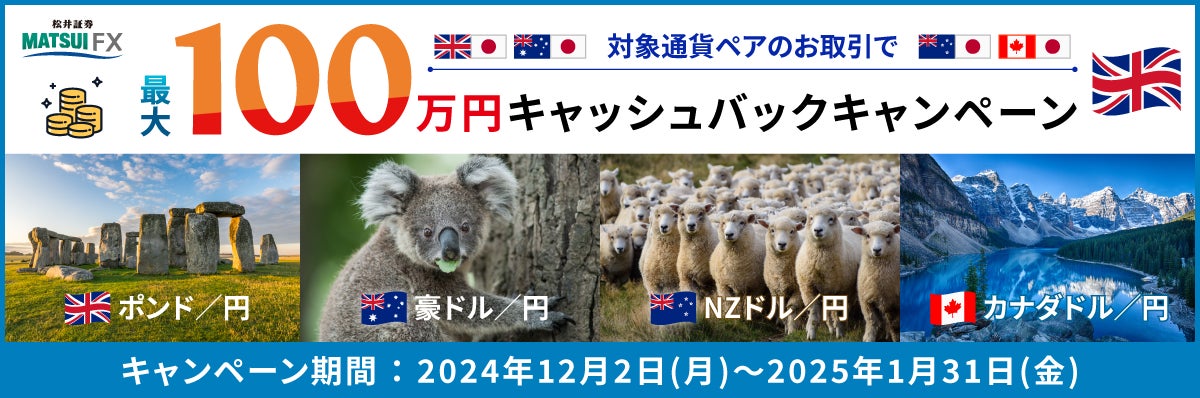 松井証券(本社:東京都千代田区、代表取締役社長:和里田 聰、以下「当社」)は、2024年12月2日(月)より、2024年10月以前にFX口座を開設いただいたお客様を対象に、当社指定の4通貨ペア(豪ドル/円・カナダドル/円・ポンド/円・NZドル/円)の新規建取引数量に応じて、最大100万円をキャッシュバックするキャンペーンを開催いたします。
