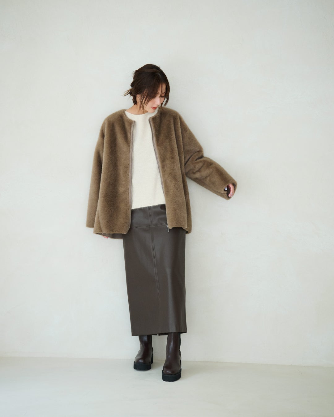 レディなドロップショルダーやシャギーにラフなミドル丈のバランス感が新鮮