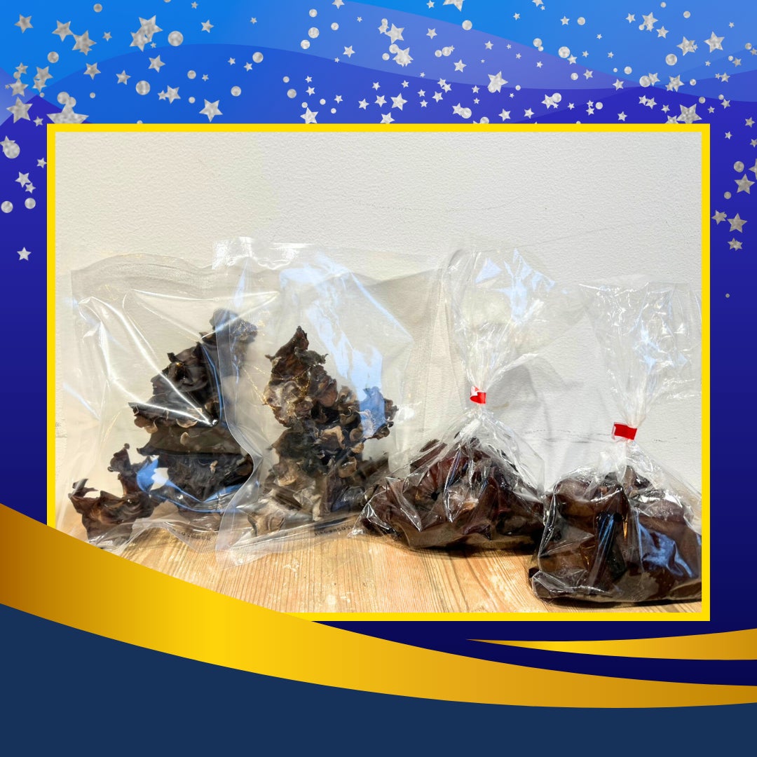 *生鮮食品を含むためクール便での発送となります。生きくらげは冷蔵で約1週間、乾燥きくらげは常温で約1年間の保存が可能です。乾燥きくらげは戻すと10倍ほどに膨らみます。
