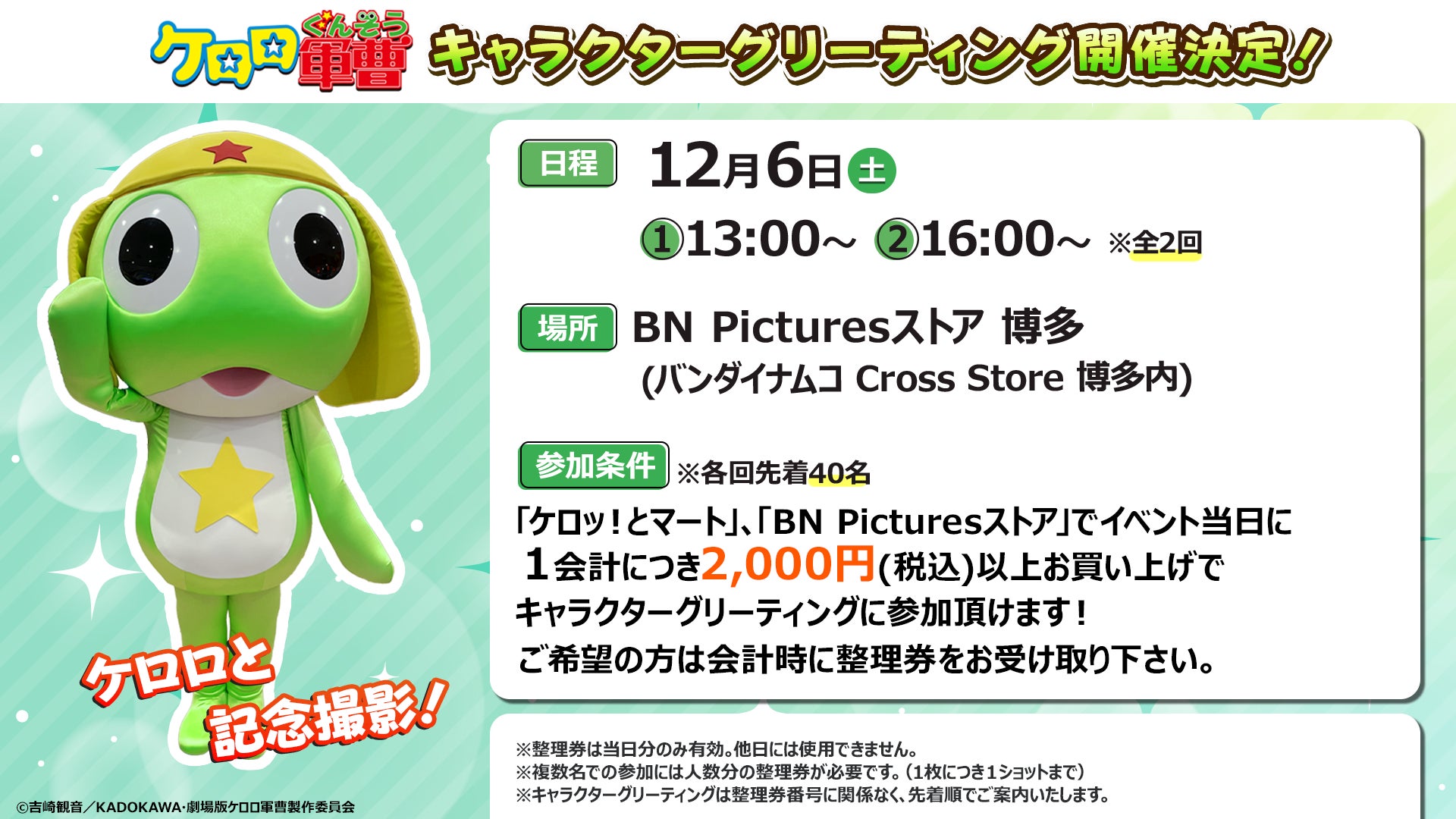 12月6日(土)に「ケロッ!とマート」及び「BN Picturesストア 」にて1会計につき2,000円(税込)以上お買い上げいただいた方は、当日実施するキャラクターグリーティングに参加いただけます。ご希望の方は会計時に整理券をお受け取り下さい。