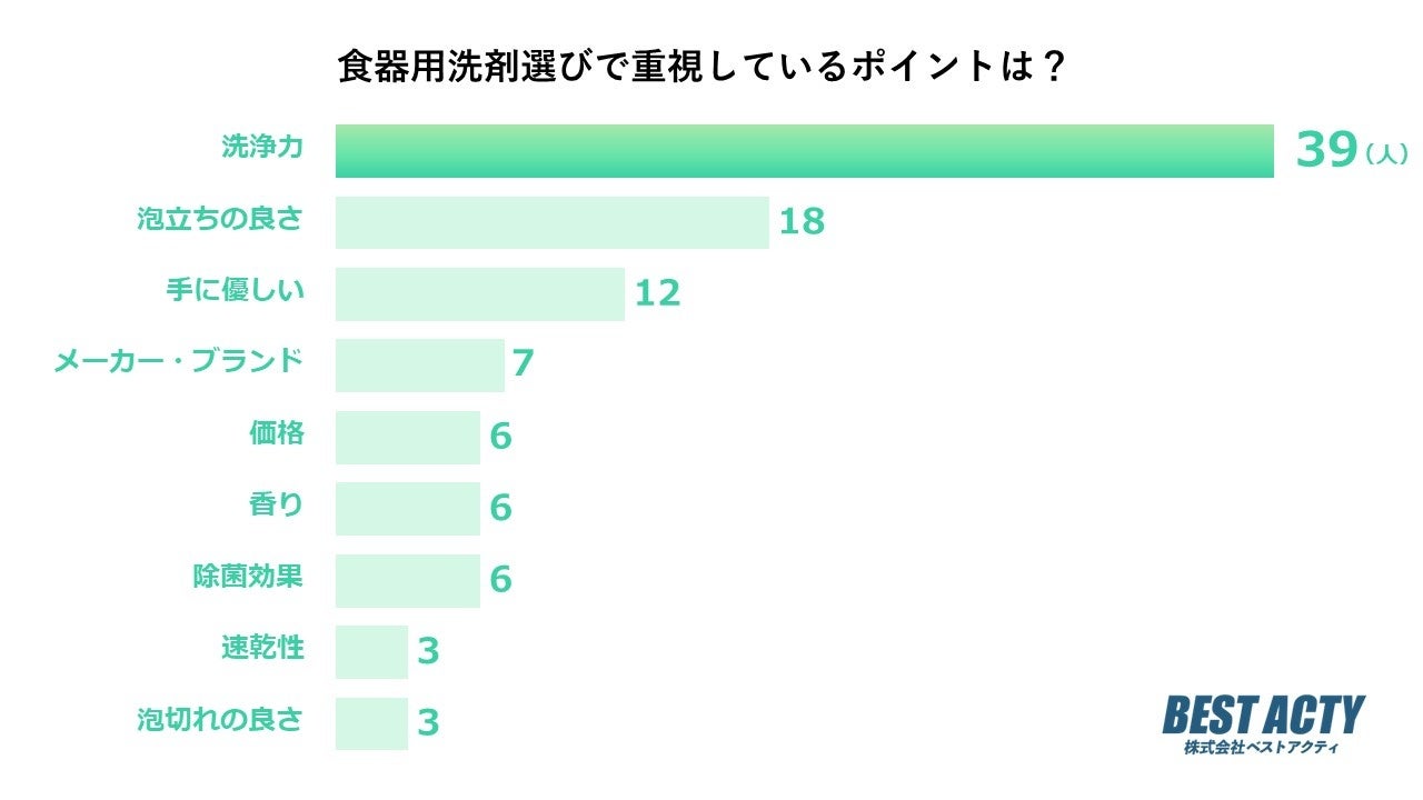 また、2位の「泡立ちの良さ」と答えた人からは、「泡立ちが悪いと汚れが落ちていない気がする」「泡立ちが良いと食器洗いが楽しい」といった声が寄せられました。
