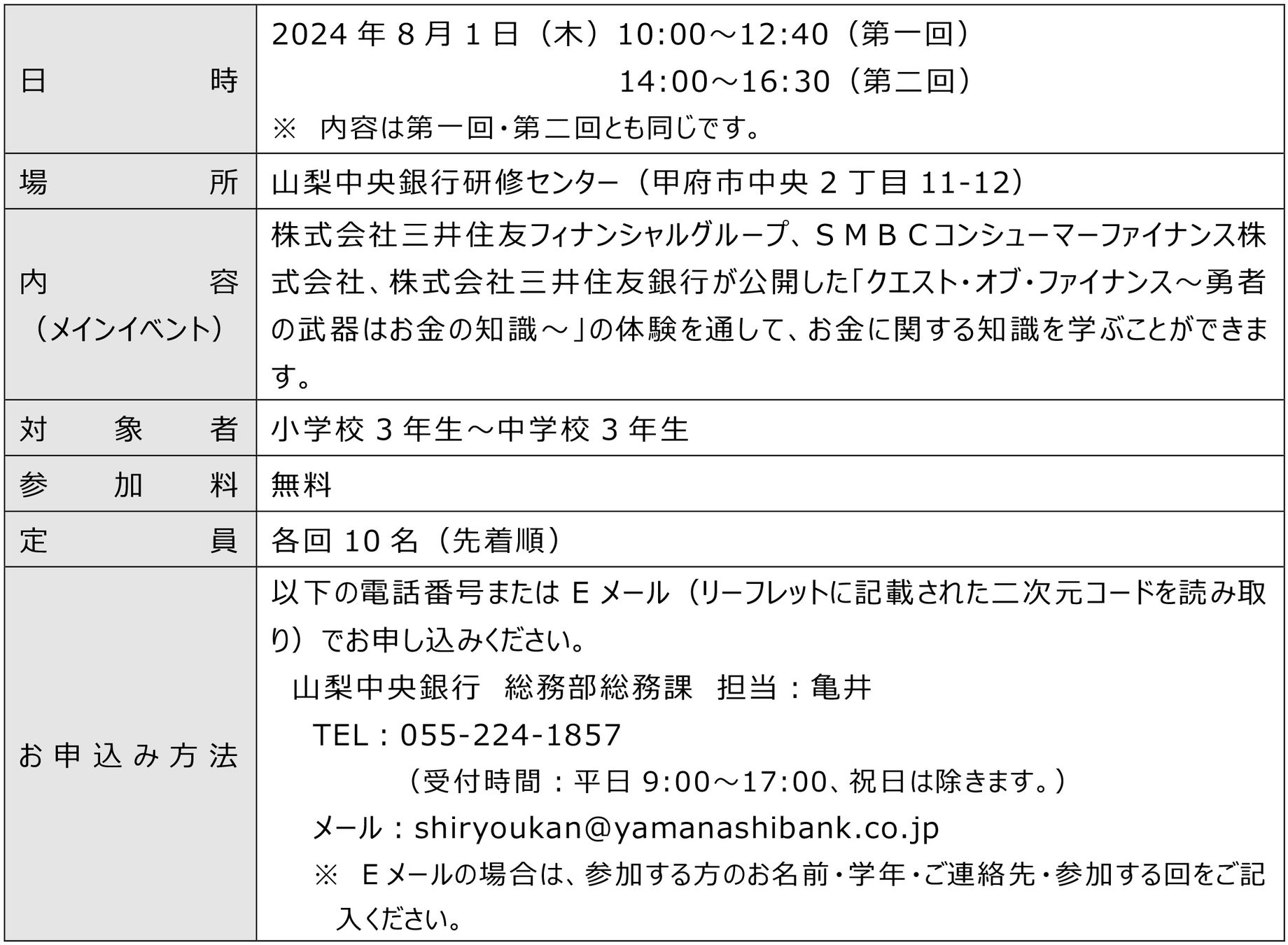 株式会社山梨中央銀行(頭取 古屋 賀章)は、SMBCコンシューマーファイナンス株式会社(代表取締役社長 髙橋 照正)のご協力のもと、夏の金融教育イベント「お金の勇者になろう~お金の力で魔王をたおせ~」を開催いたします。