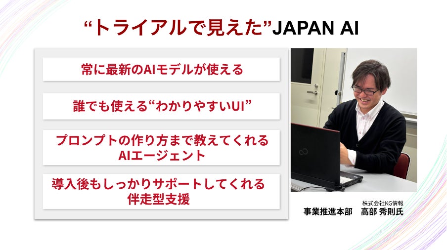 JAPAN AIを80点を取る“パートナー”として迎え入れると良いと思います。AIを導入した瞬間に、業務のすべてが置き換わるわけではありませんし、「完璧に任せよう」とすると、おそらくうまくいかない。私たちはむしろ、80点を取ってくれる“パートナー”として付き合うのが一番現実的で、結果的に成果も出やすいと思っています。