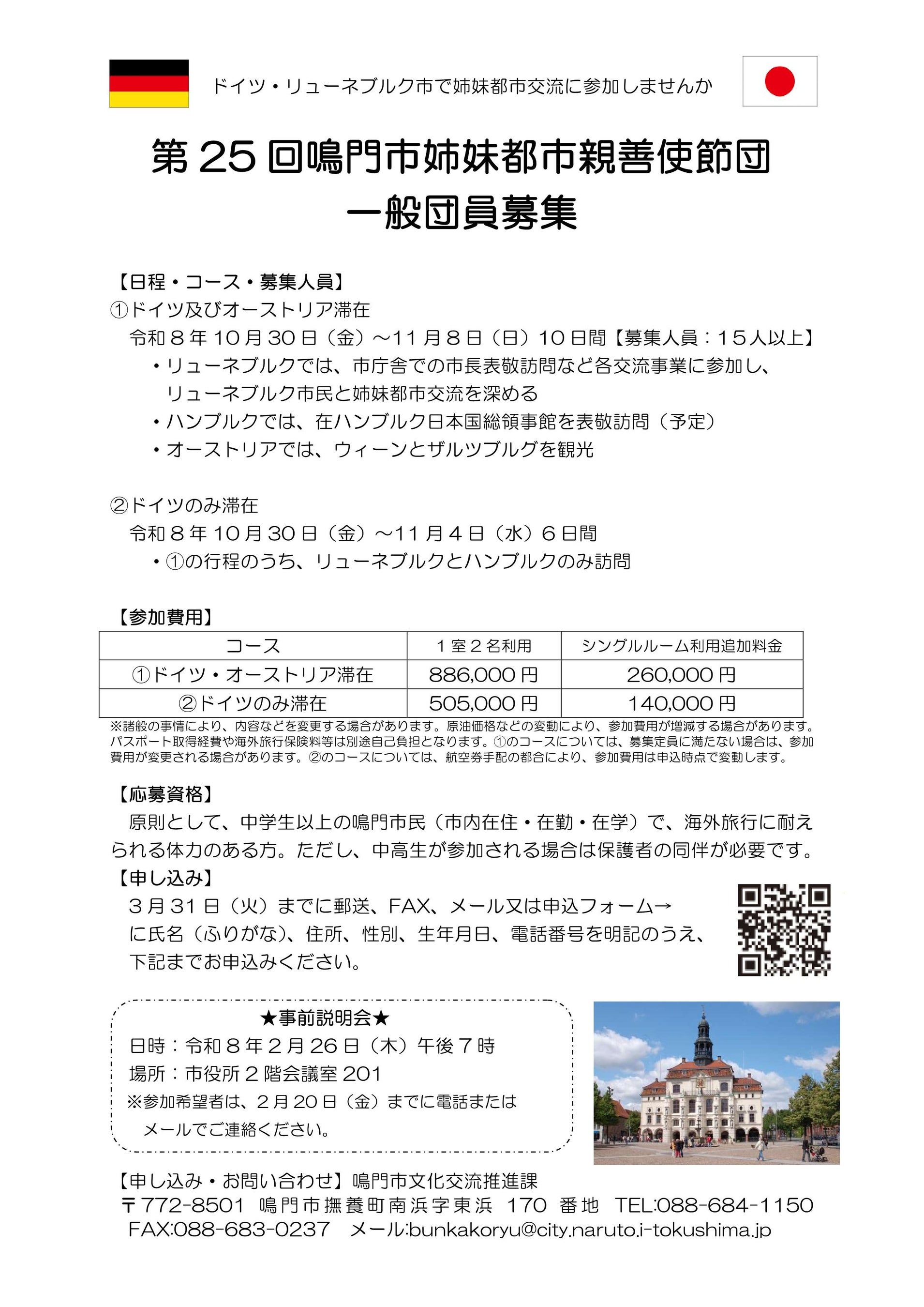 【徳島県 鳴門市役所】ドイツの姉妹都市リューネブルク市へ行こう!親善使節団(一般・青少年)参加者募集!!