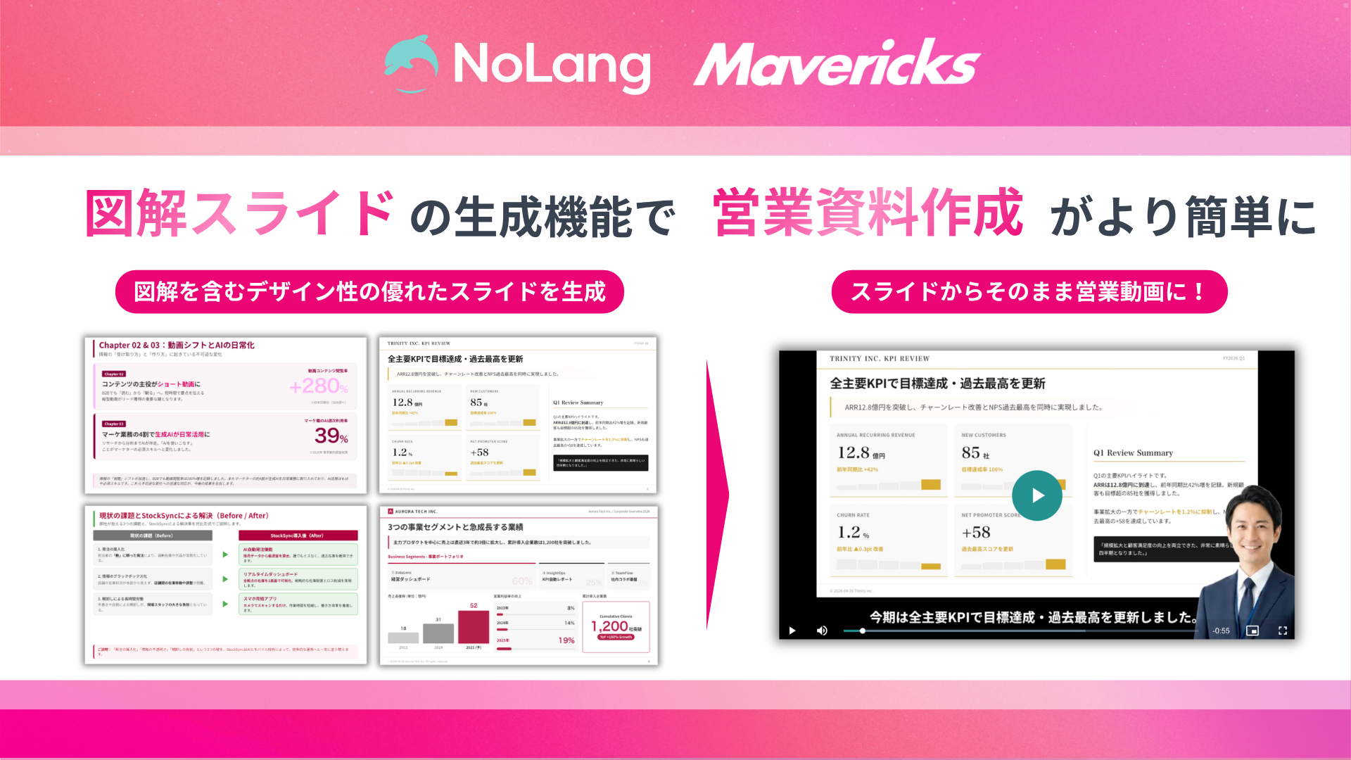 日本発、動画生成AI「NoLang(ノーラン)」を提供する株式会社Mavericks(本社:東京都文京区、代表者:代表取締役社長 奥野 将太)は、この度、NoLangのスライド生成機能において、図解・インフォグラフィックを豊富に含む横型16:9スライドを生成できる機能の提供を新たに開始予定です(2026年4月末公開予定)。