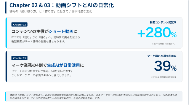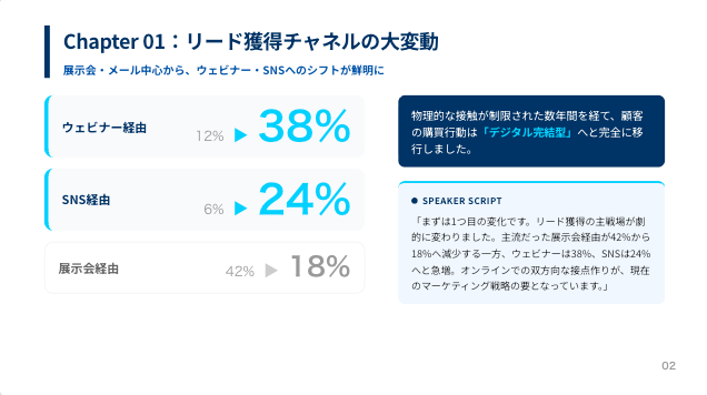 さらに、社内研修・マニュアル・社内共有資料としても有効です。人事研修、コンプライアンス研修、プロダクト勉強会、社内KPI共有会など、従業員向けに繰り返し発信する資料を、図解を含む見やすい形で量産できます。AIナレーションと字幕を付与した動画にすれば、集合研修に参加できなかった社員向けの非同期学習コンテンツとしても展開でき、研修部門の負荷を大幅に軽減します。
