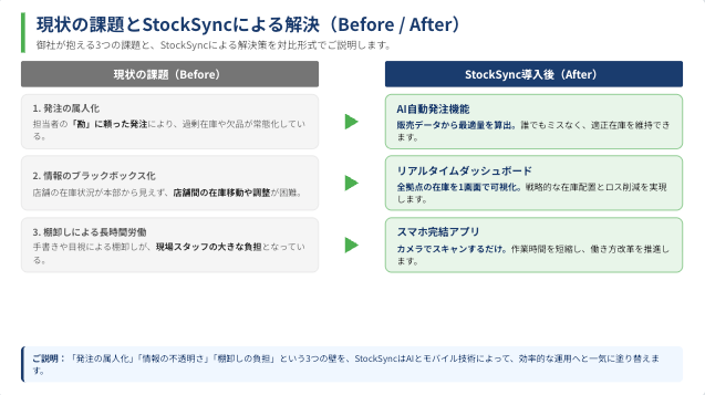 また、資料制作を外部デザイナーやパートナーへ委託する場合、1スライドあたり3,000〜15,000円、ボリュームのある資料1本では数万円〜数十万円の制作費が発生し、急ぎの案件や頻度の高い社内用途では外注の費用・納期がボトルネックとなります(※4)。結果として、「伝わる図解入り資料」を必要な頻度で安定的に量産することが、多くの企業にとって大きな負担となっているのが現状です。