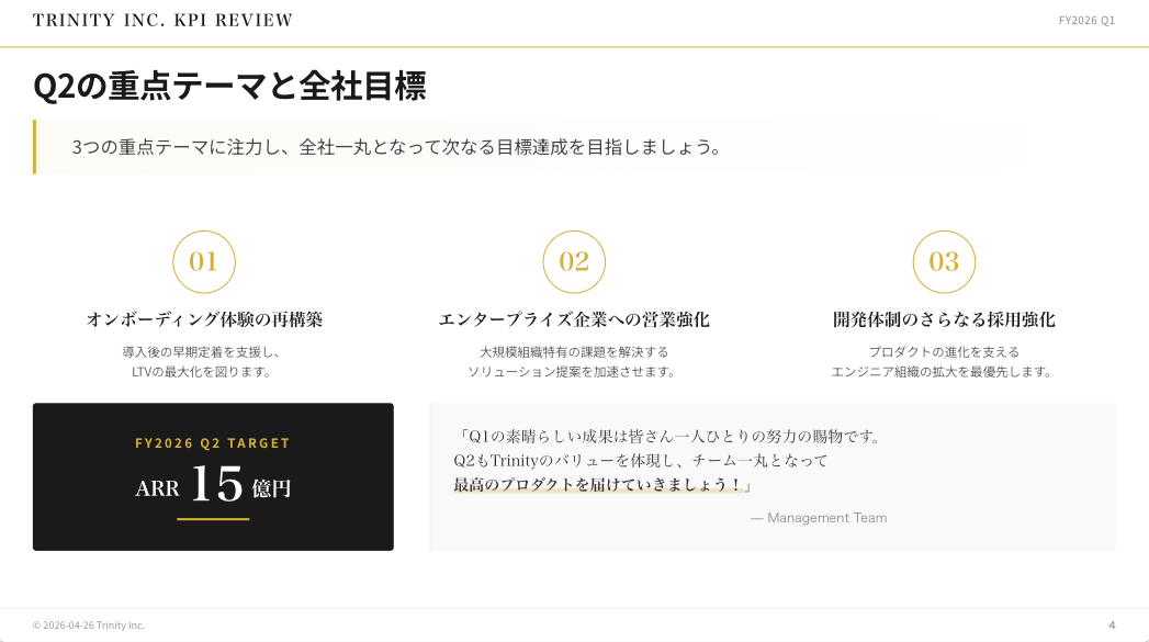 加えて、IR・会社紹介・採用資料にも活用できます。決算サマリー、中期経営計画のハイライト、会社案内、採用ピッチなどは、図解で事業構造や実績の推移を分かりやすく示すことが定番のフォーマットです。NoLangの図解スライド生成機能を使えば、データの羅列ではない"読み手の理解を誘導する"資料を、自社の情報資産から直接生成でき、投資家・候補者に対して継続的にプロフェッショナルな情報発信が可能になります。