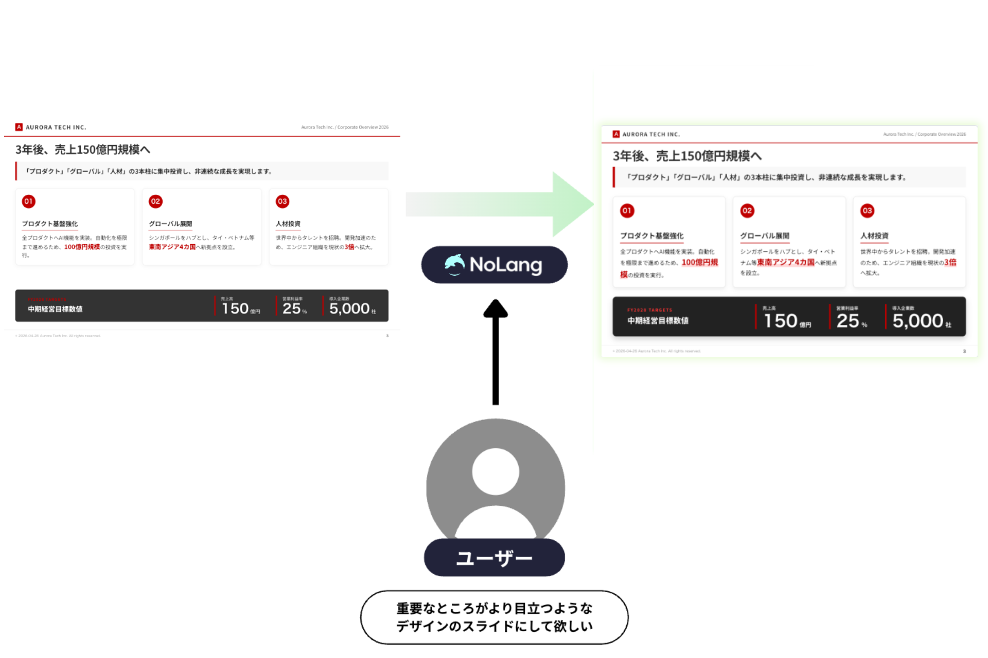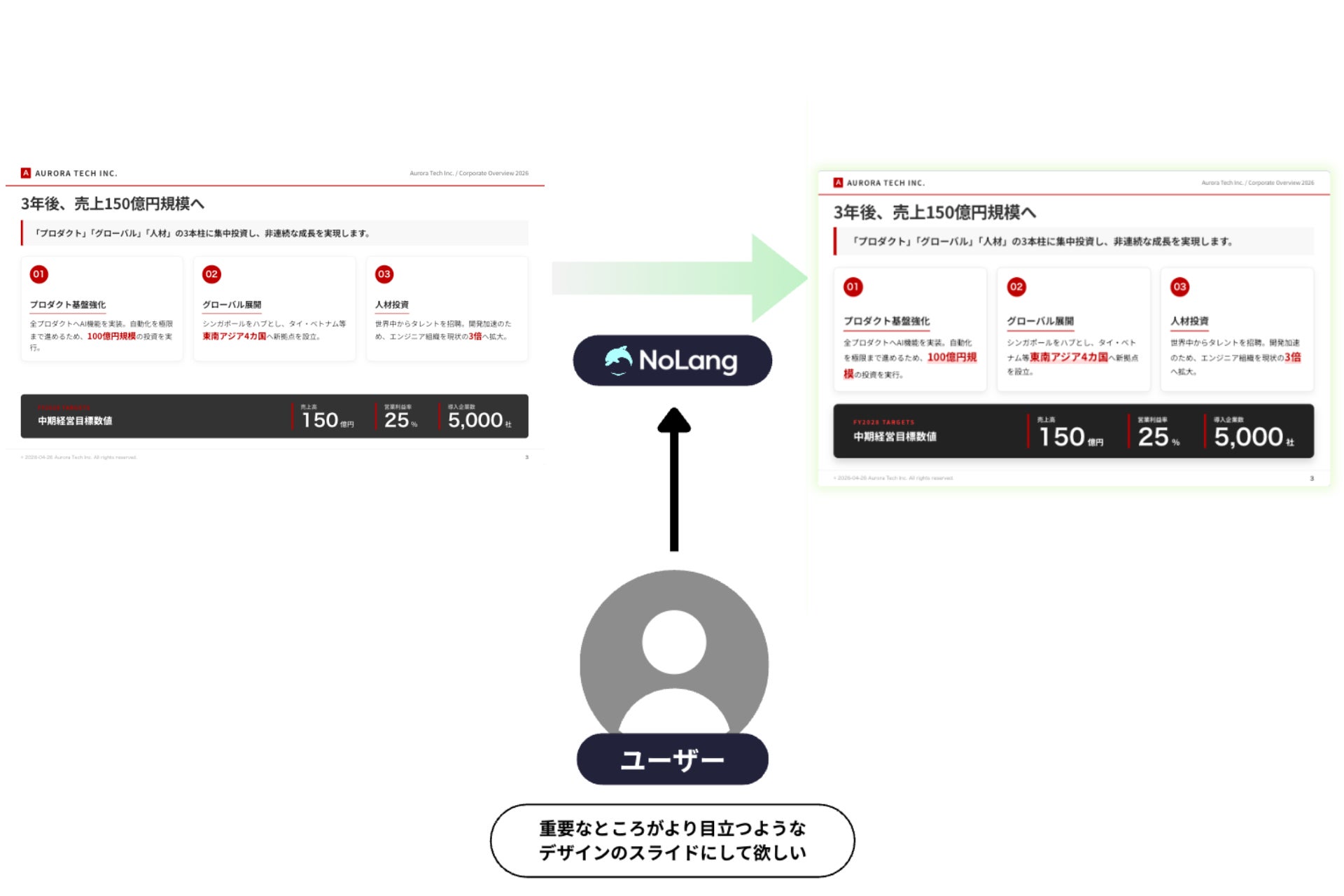 従来、NoLangのスライド生成機能では情報伝達に特化したシンプルなデザインのスライドを中心に提供してきましたが、本アップデートにより、組織図・フローチャート・タイムライン・比較表といった図解を含むデザイン性の高い本格的なビジネススライドをAIが自動で生成できるようになります。営業提案・ウェビナー・社内研修など、幅広いビジネス用途で活用できる資料を、デザインの専門知識がないユーザーでも短時間で作成できる環境を実現します。