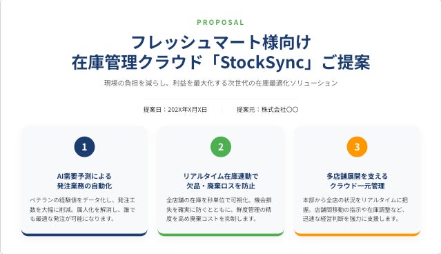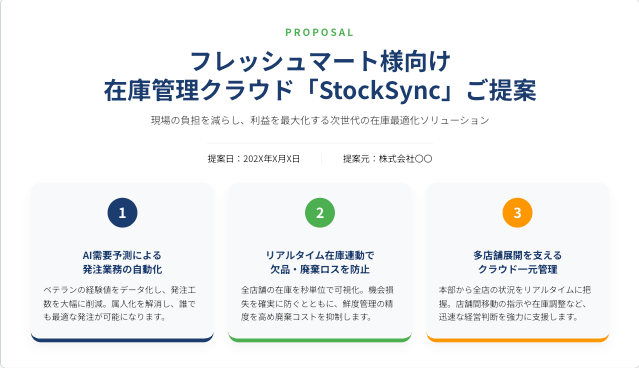 まず、営業・提案資料としての活用です。商品・サービスの機能説明、導入事例、比較表、価格プラン、導入効果などを、図解・インフォグラフィックを含む視覚的に伝わる形でスライド化できます。従来、デザイナーや外注パートナーに依頼していたような"伝わる提案資料"を、営業担当者自身が必要なタイミングで短時間で作成できるようになり、商談スピードと提案の質を同時に高めることが可能になります。