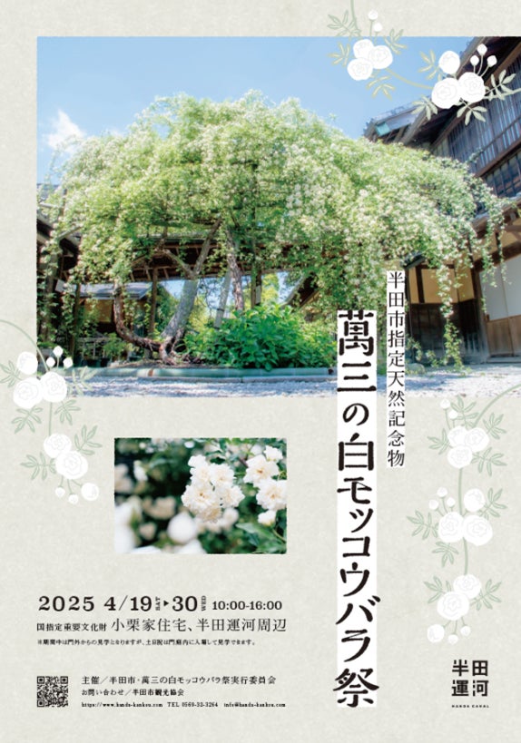国指定重要文化財「小栗家住宅」の庭にある、樹齢150年を超える日本最古・最大級の白モッコウバラ「萬三の白モッコウバラ」を開花の時期に合わせて特別公開します。