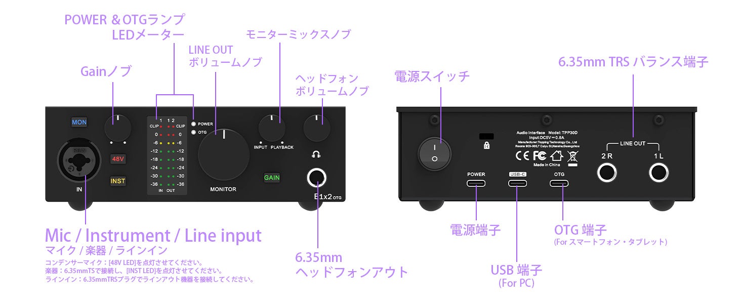 マイク入力:コンボジャック×1 (48Vファンタム電源スイッチ装備)
