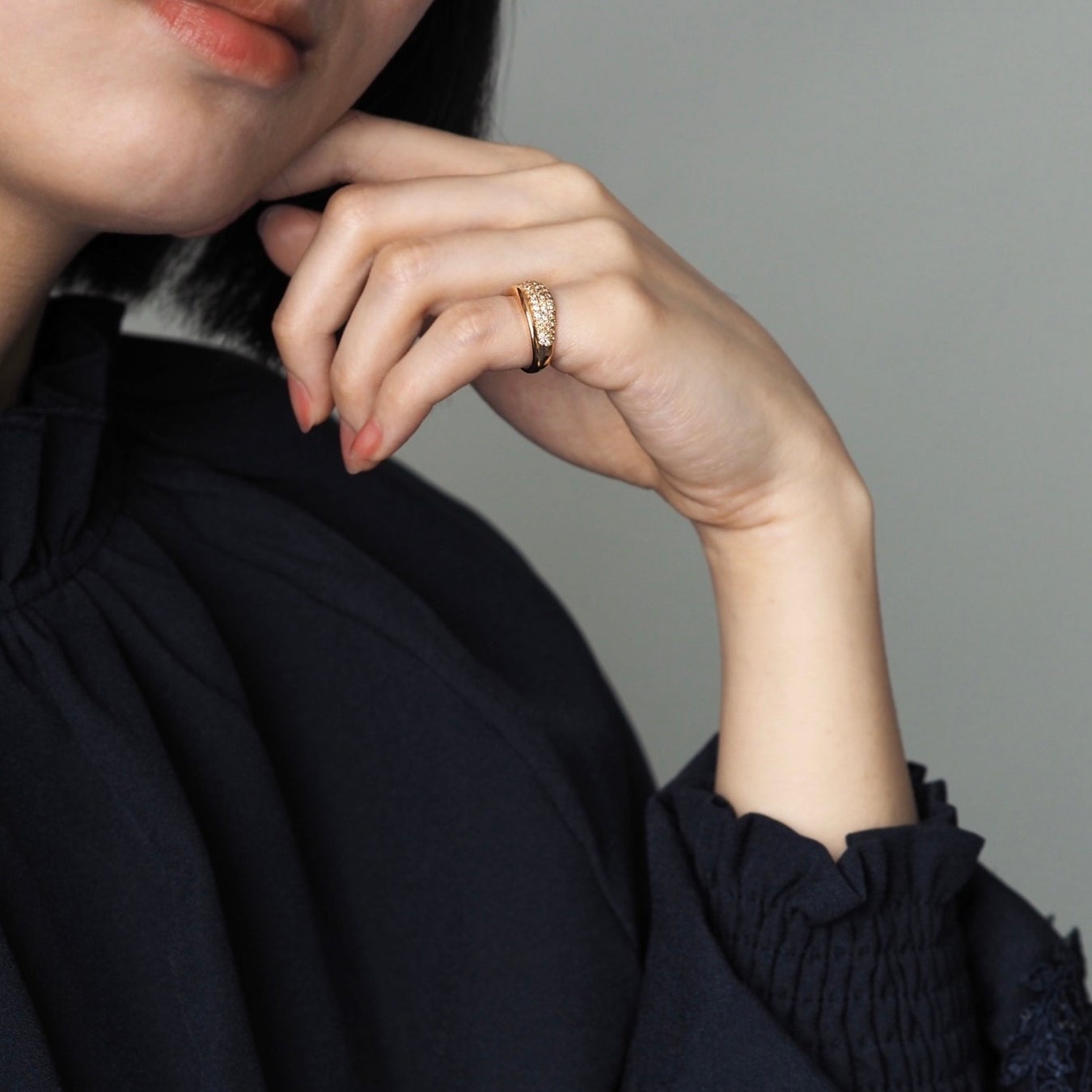 “留めが命”のパヴェリング。ダイヤモンドのサイズ・高さ・色味にまでこだわり、当初のサンプルよりもグレードを上げて完成させた一点です。地金はホワイト・イエロー・ピンクの3種類をご用意。たっぷりとした重厚感と、滑らかな着け心地。地金がパヴェの輝きを引き立て、指先を美しく見せてくれます。サイズ調整も可能となっております。