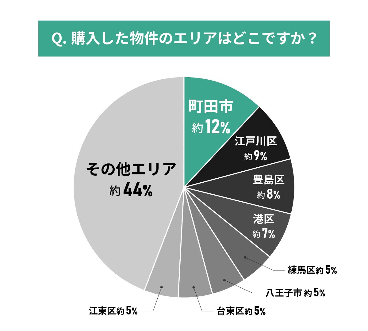 町田市が最も多く約12%を占めています。次に江戸川区が約9%、豊島区が約8%と続きます。上位8エリアで全体の約56%を占めていますが、その他のエリアも多岐にわたっており、購入者の選択は広範囲に分散しています。
