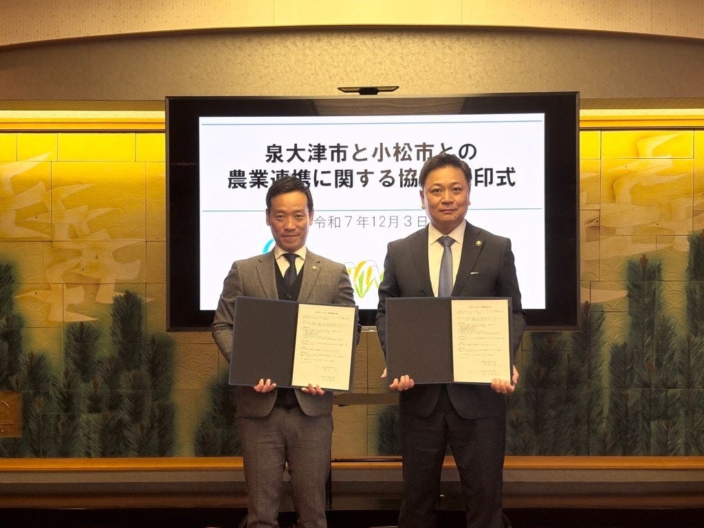 泉大津市(市長:南出賢一)と小松市(市長:宮橋勝栄)は、令和7年12月3日に「農業を通じた連携による持続可能なまちづくり」など4項目にわたる農業連携協定を締結しました。
